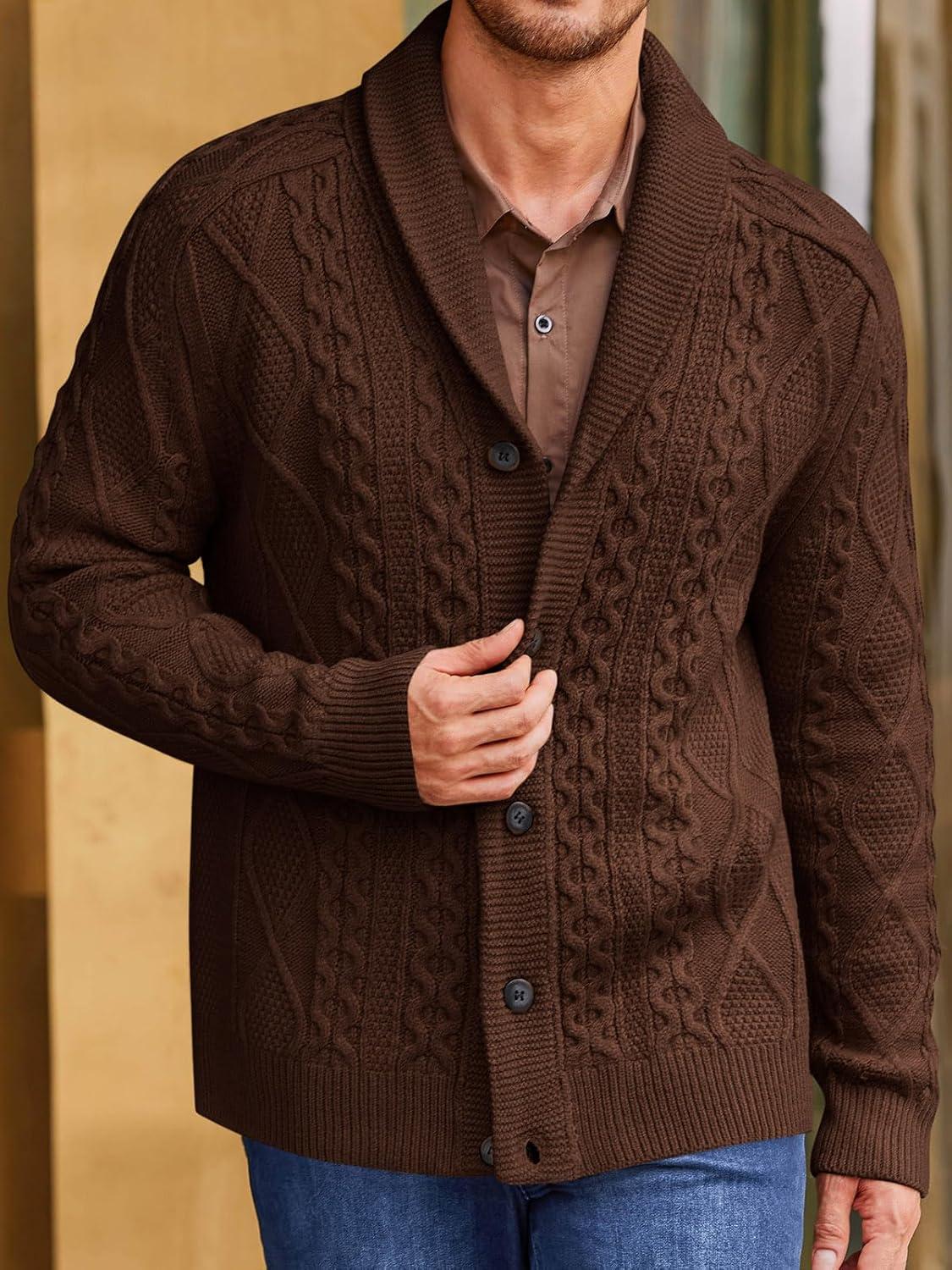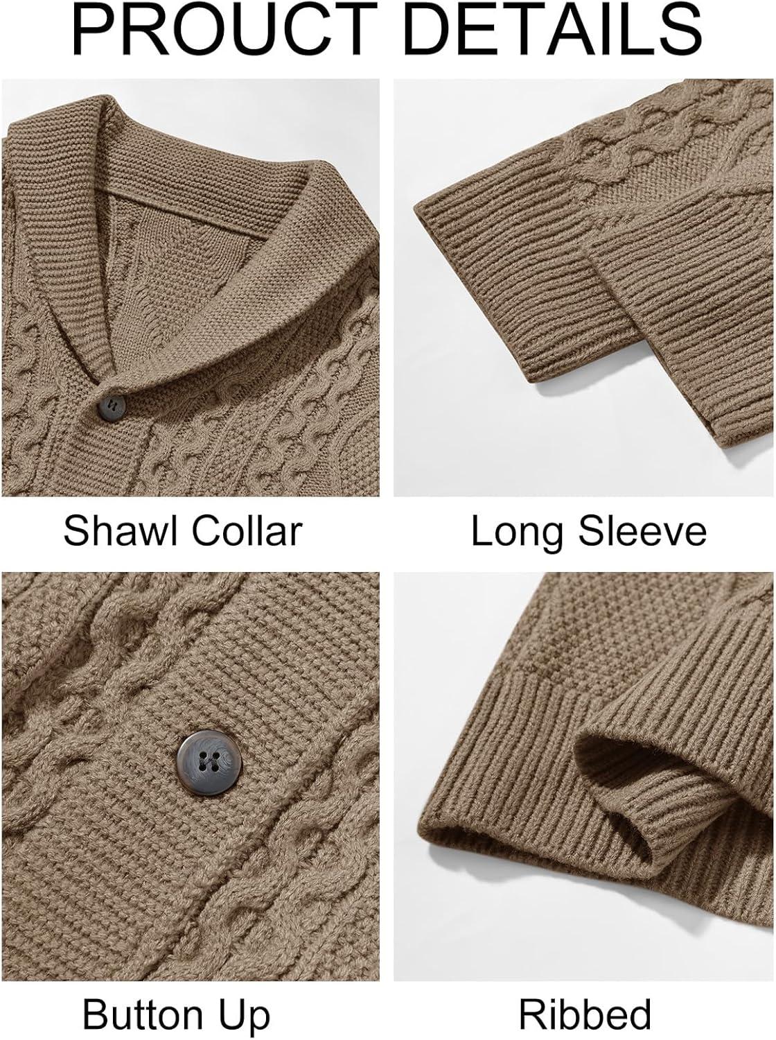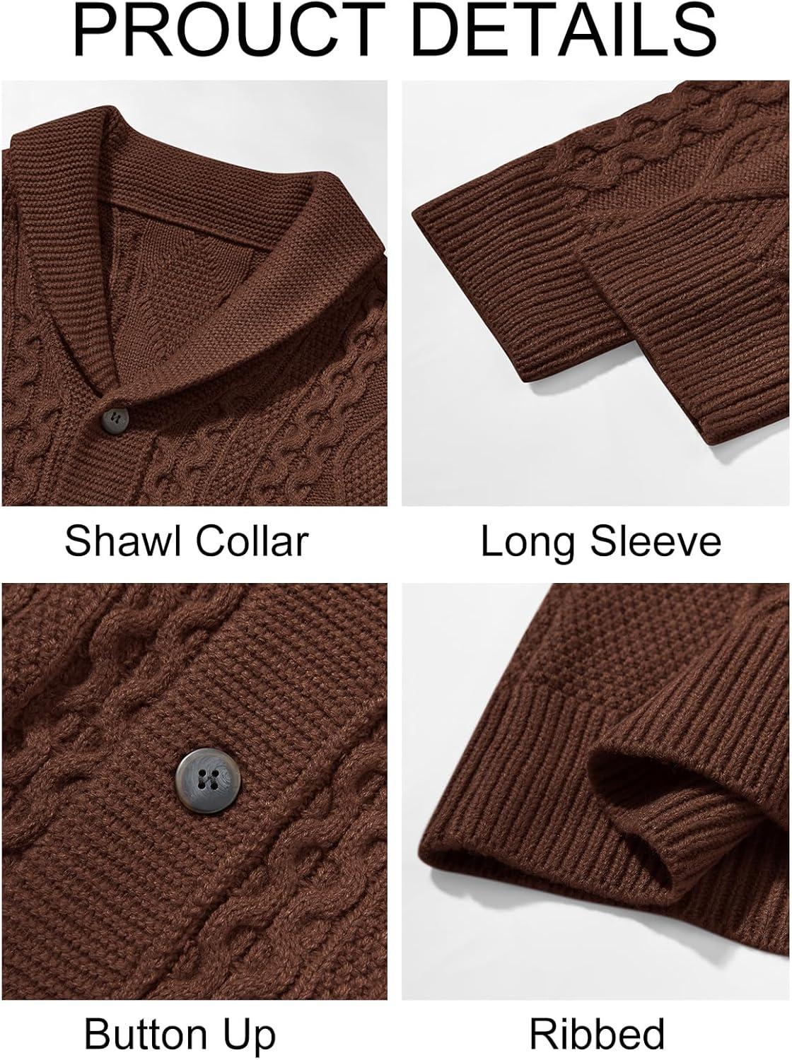 Runcati Mens Cable Knit Cardigan Sweater Shawl Collar Casual Button Down Long Sleeve Sweaters(Brown)