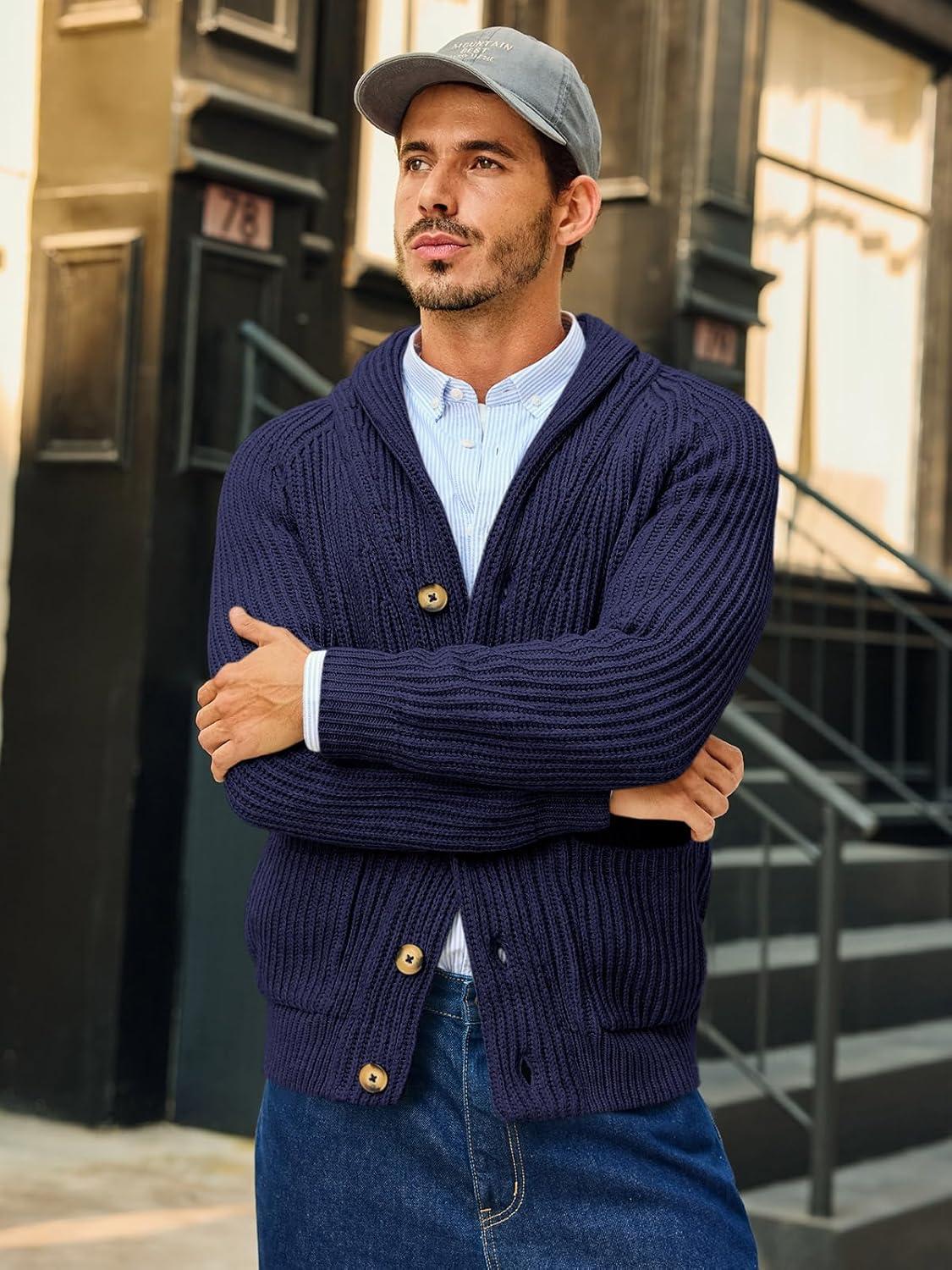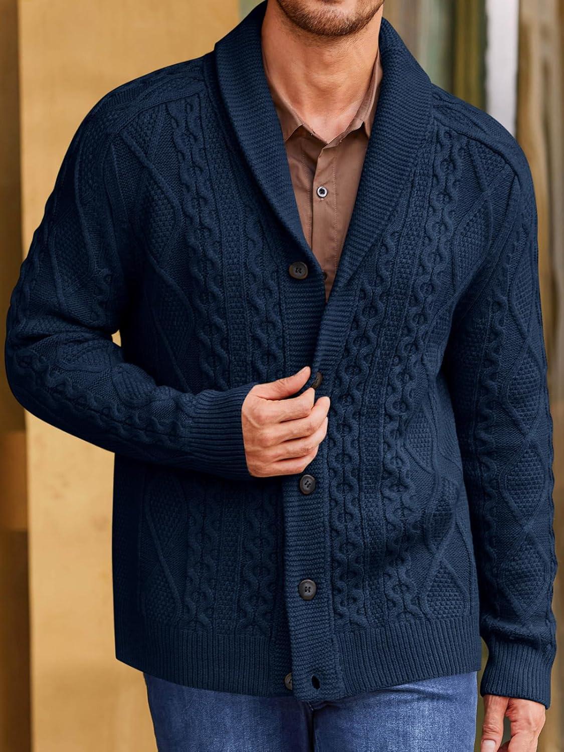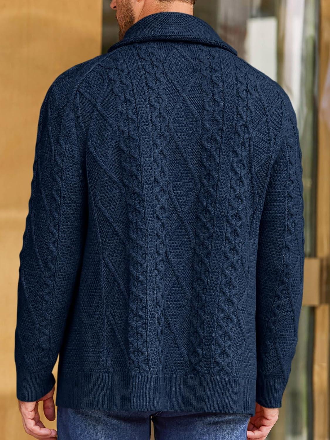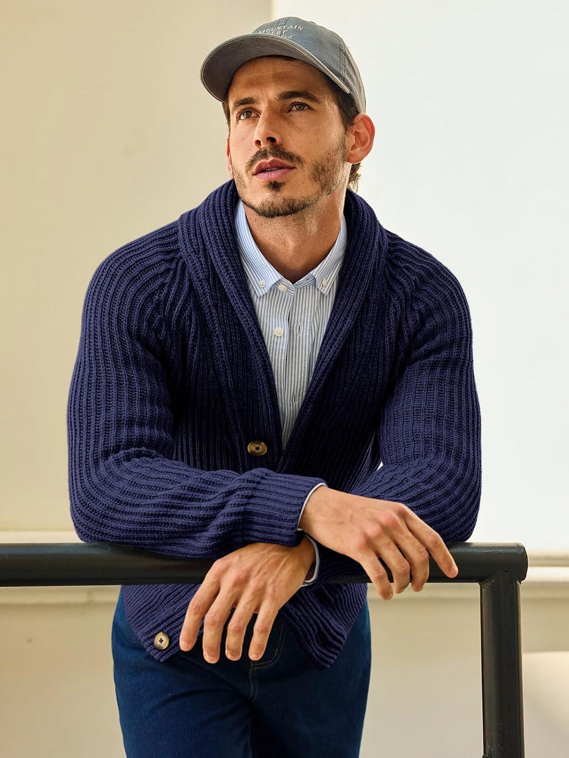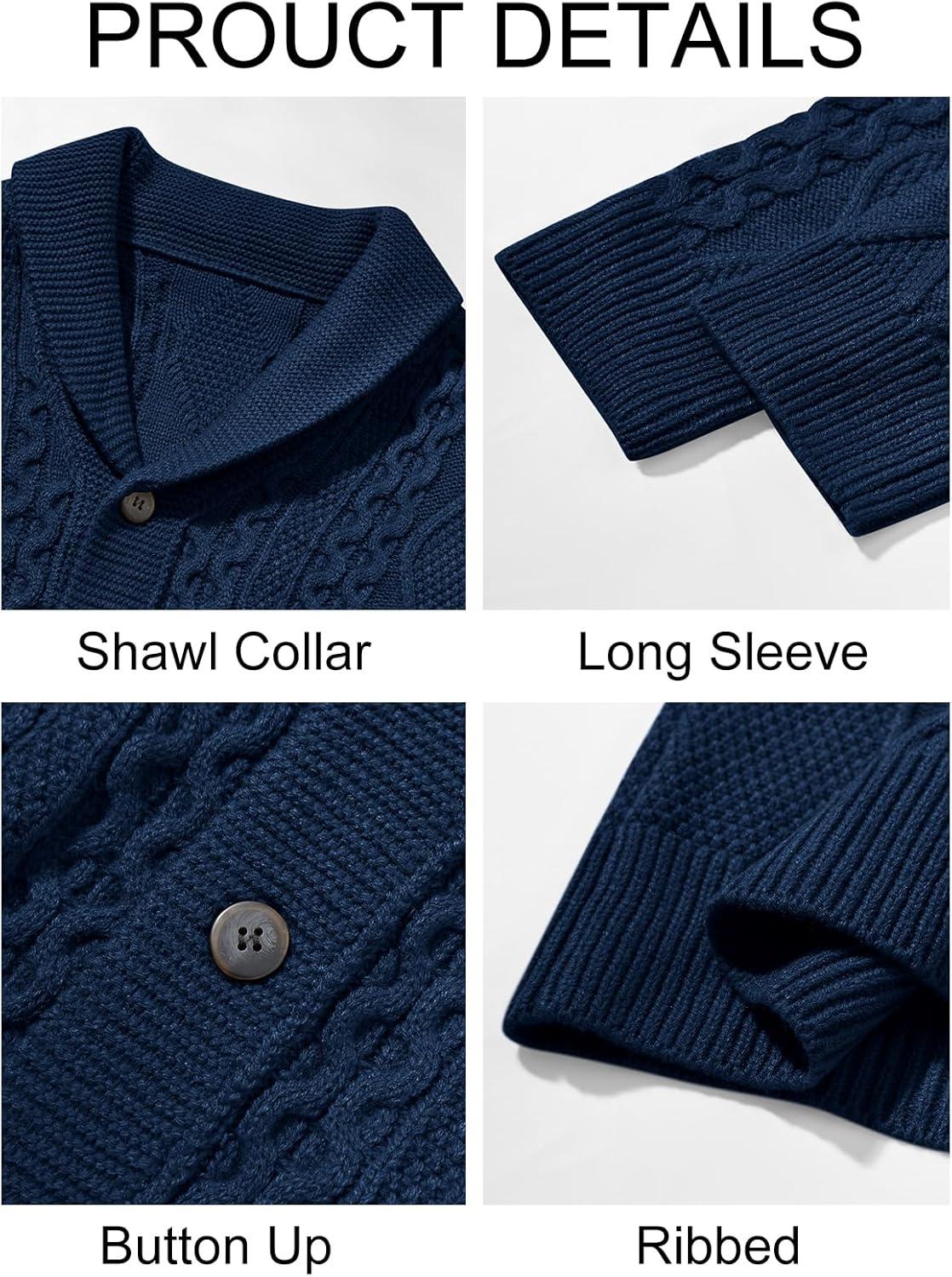 Runcati Mens Shawl Collar Cardigan Sweater Cable Knitted Button Down Sweaters Chunky Fall Winter Outwear(Navy Blue)
