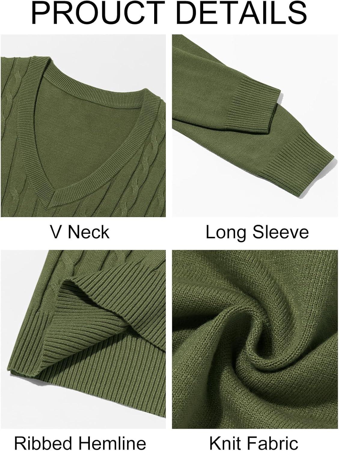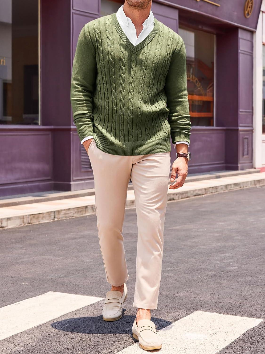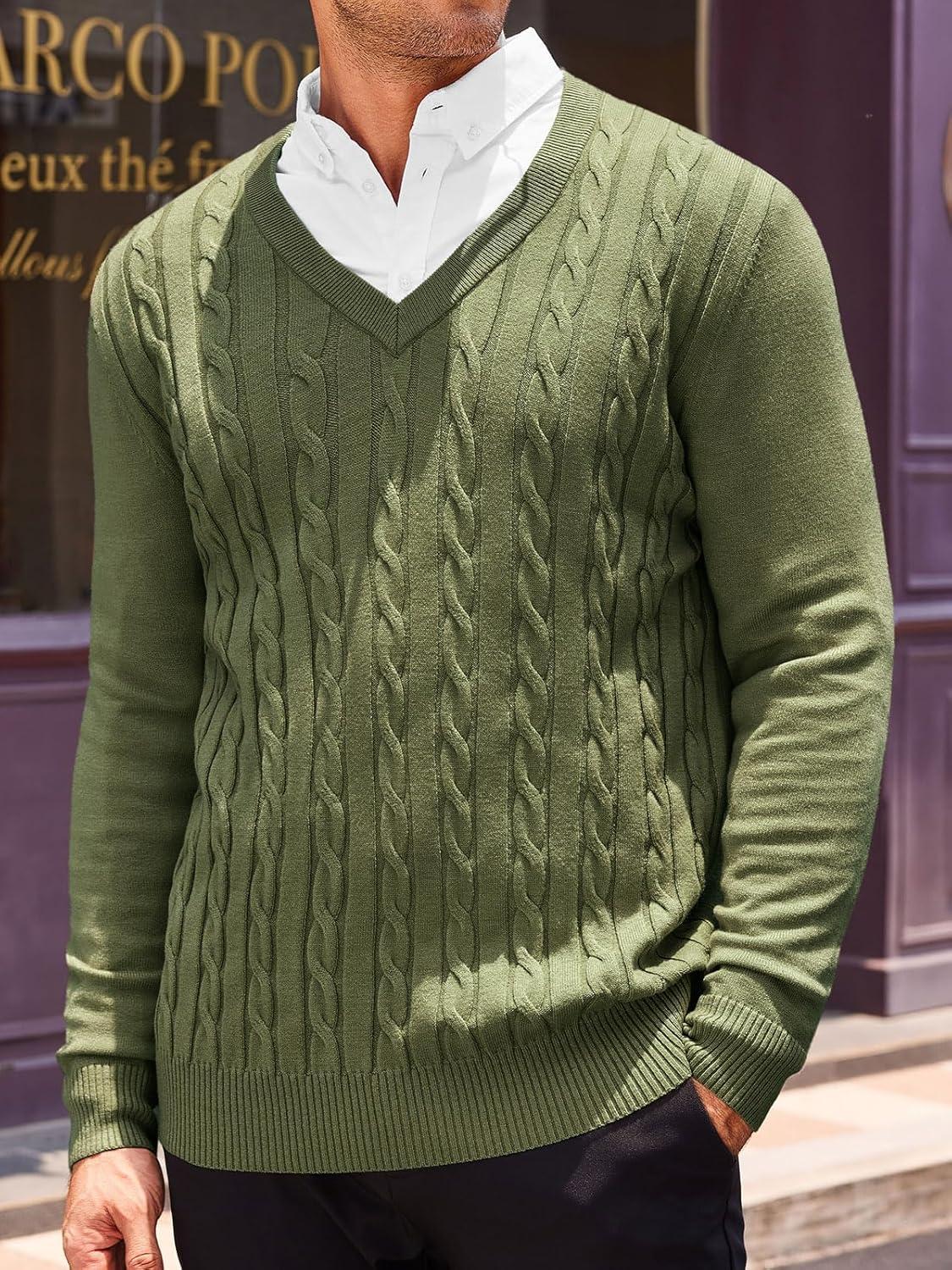 Runcati Mens V Neck Sweater Cable Knit Long Sleeve Casual Ribbed Twisted Pullover Sweaters(Army Green)