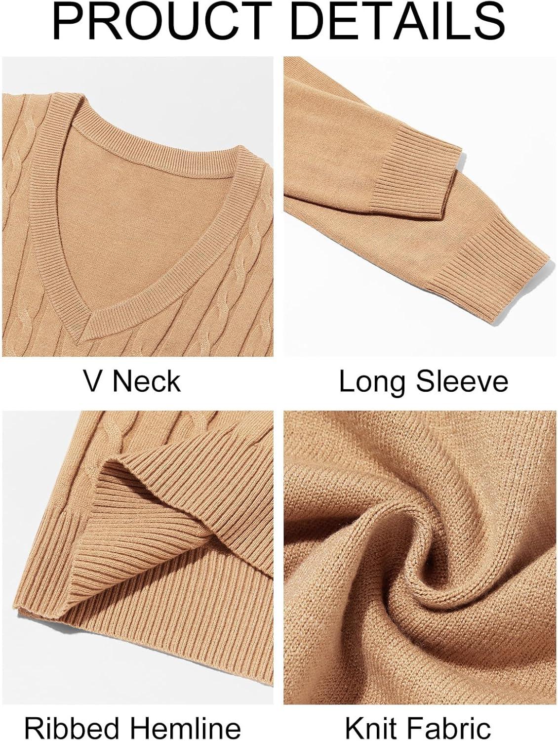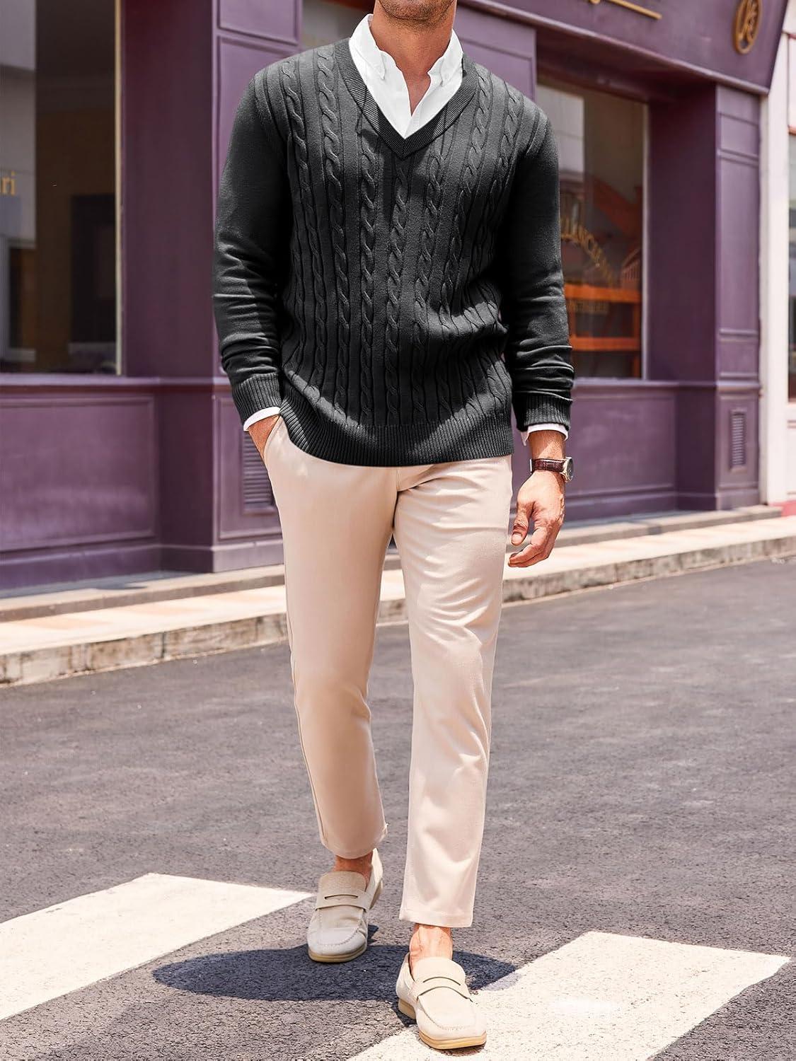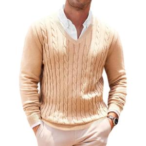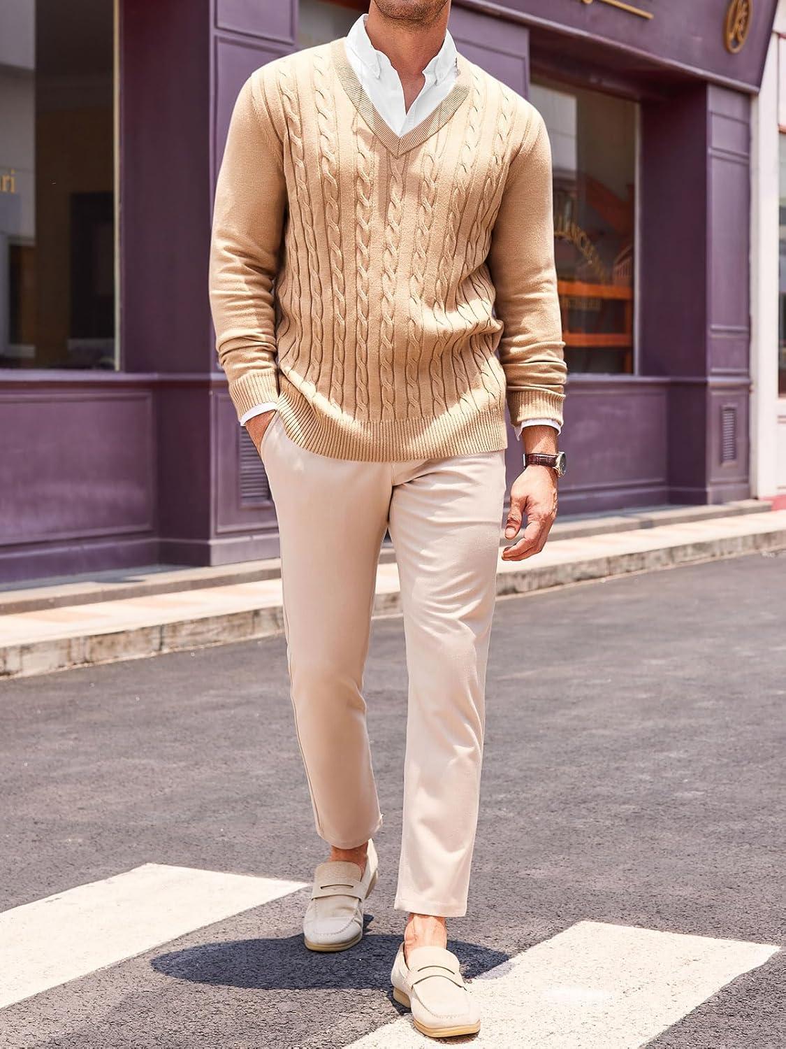 Runcati Mens V Neck Sweater Cable Knit Long Sleeve Casual Ribbed Twisted Pullover Sweaters(Khaki)