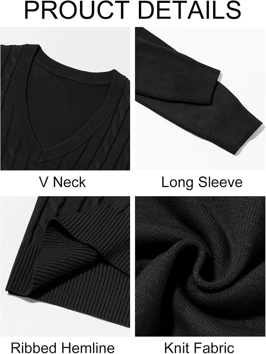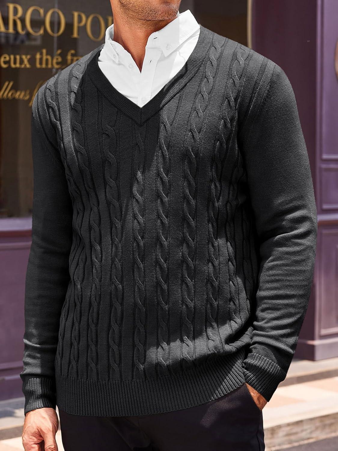 Runcati Mens V Neck Sweater Cable Knit Long Sleeve Casual Ribbed Twisted Pullover Sweaters(Black)