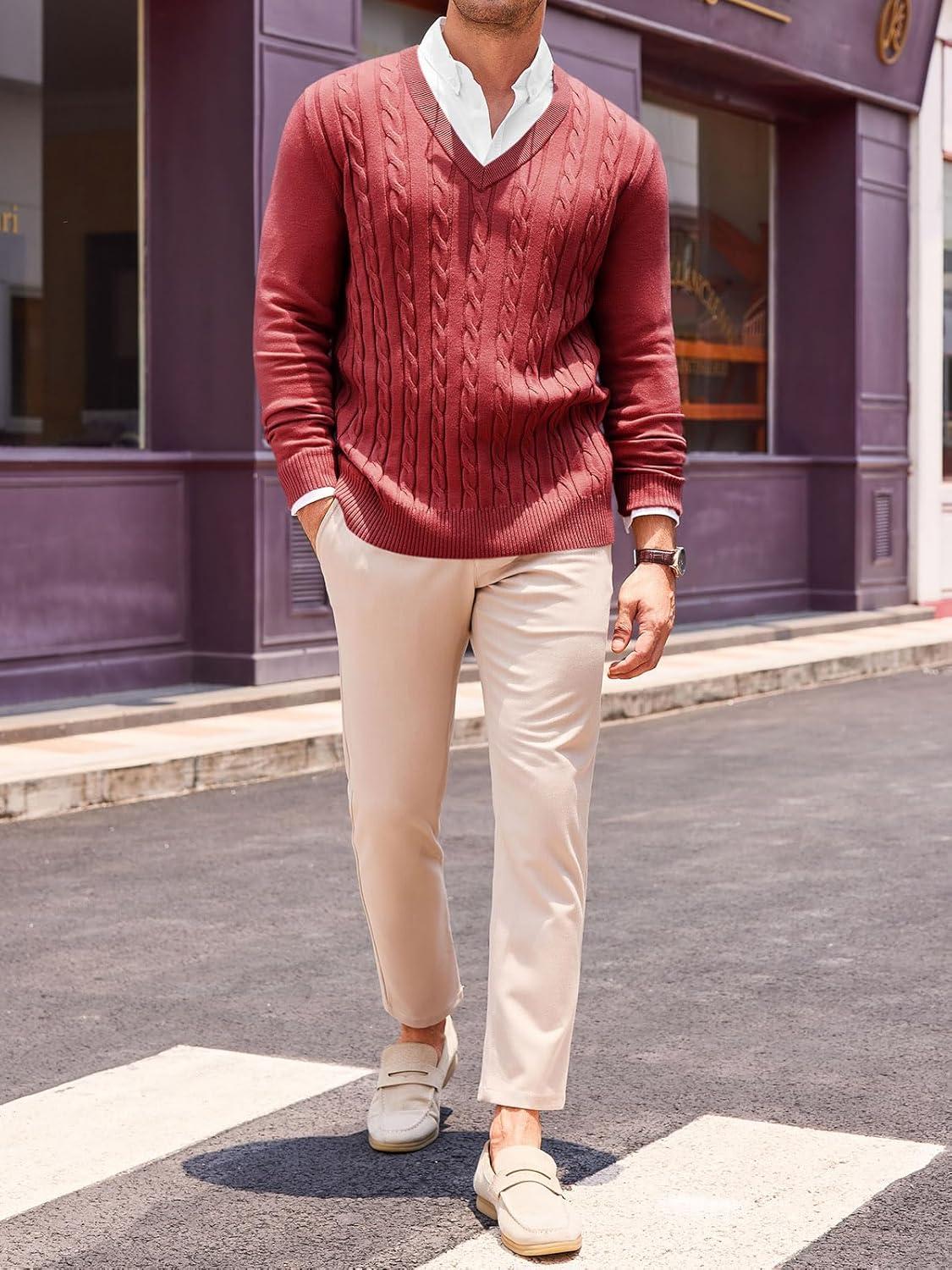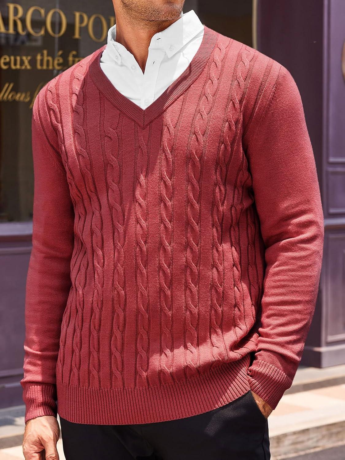 Runcati Mens V Neck Sweater Cable Knit Long Sleeve Casual Ribbed Twisted Pullover Sweaters(Red)