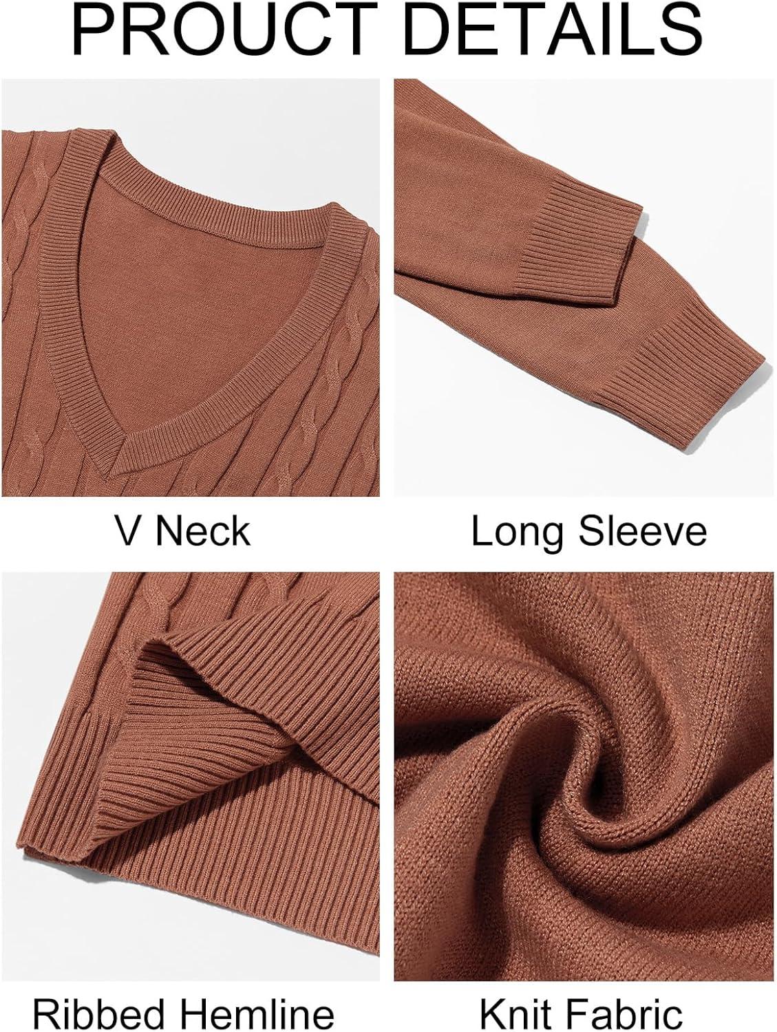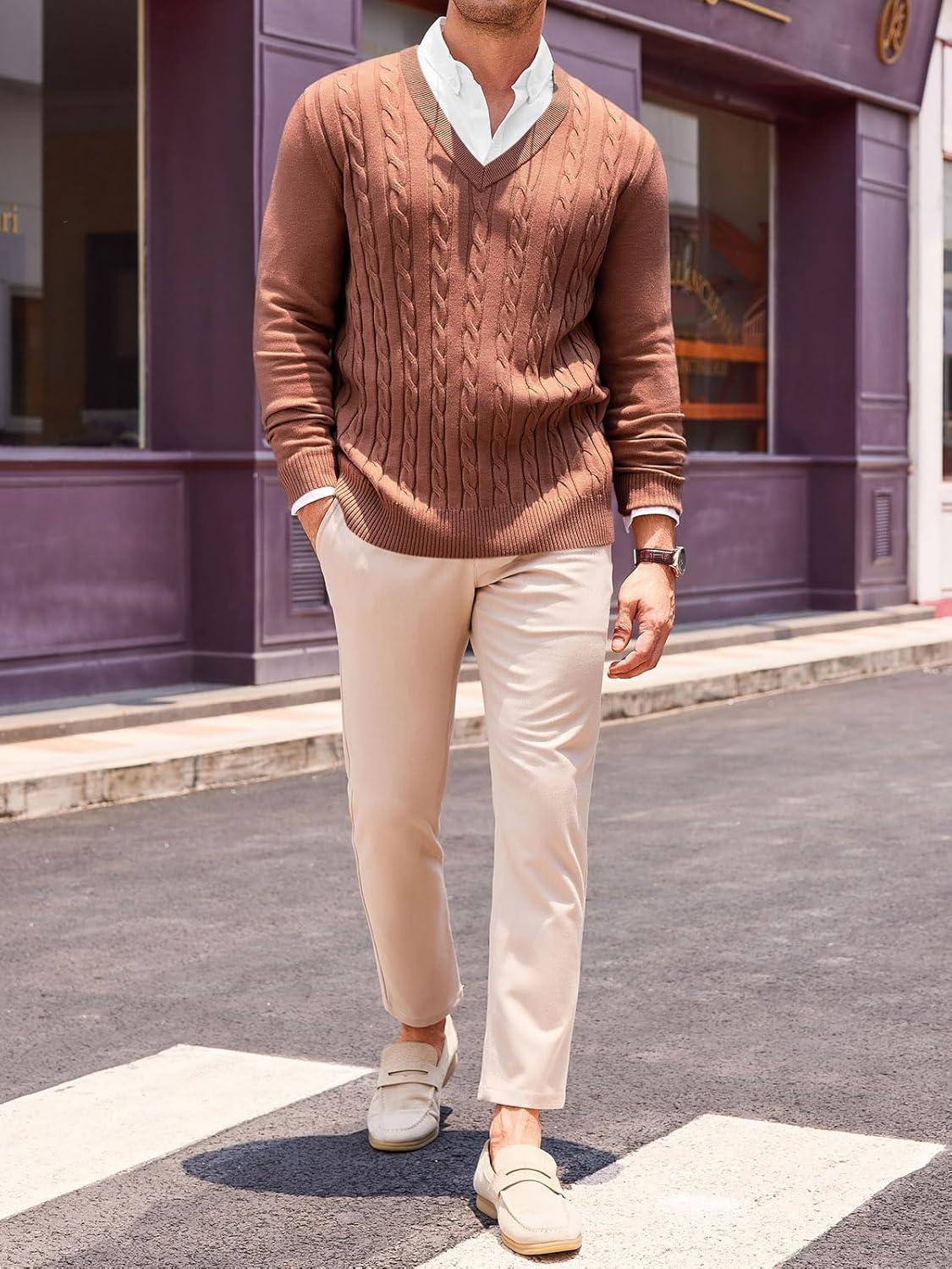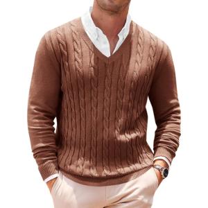 Runcati Mens V Neck Sweater Cable Knit Long Sleeve Casual Ribbed Twisted Pullover Sweaters(Coffee)
