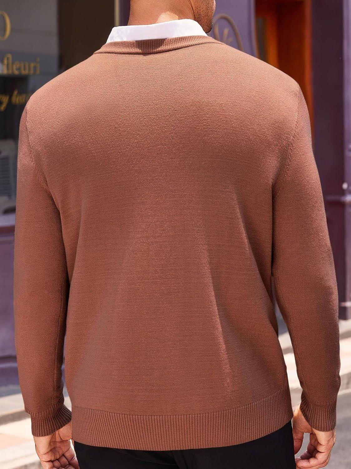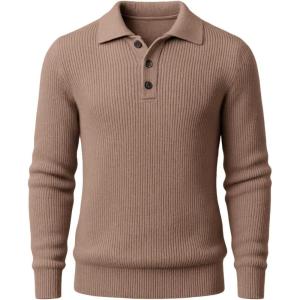 Runcati Mens Long Sleeve Polo Sweater Knit Polos V Neck Casual Dress Button Collared Pullover Sweaters(Khaki)