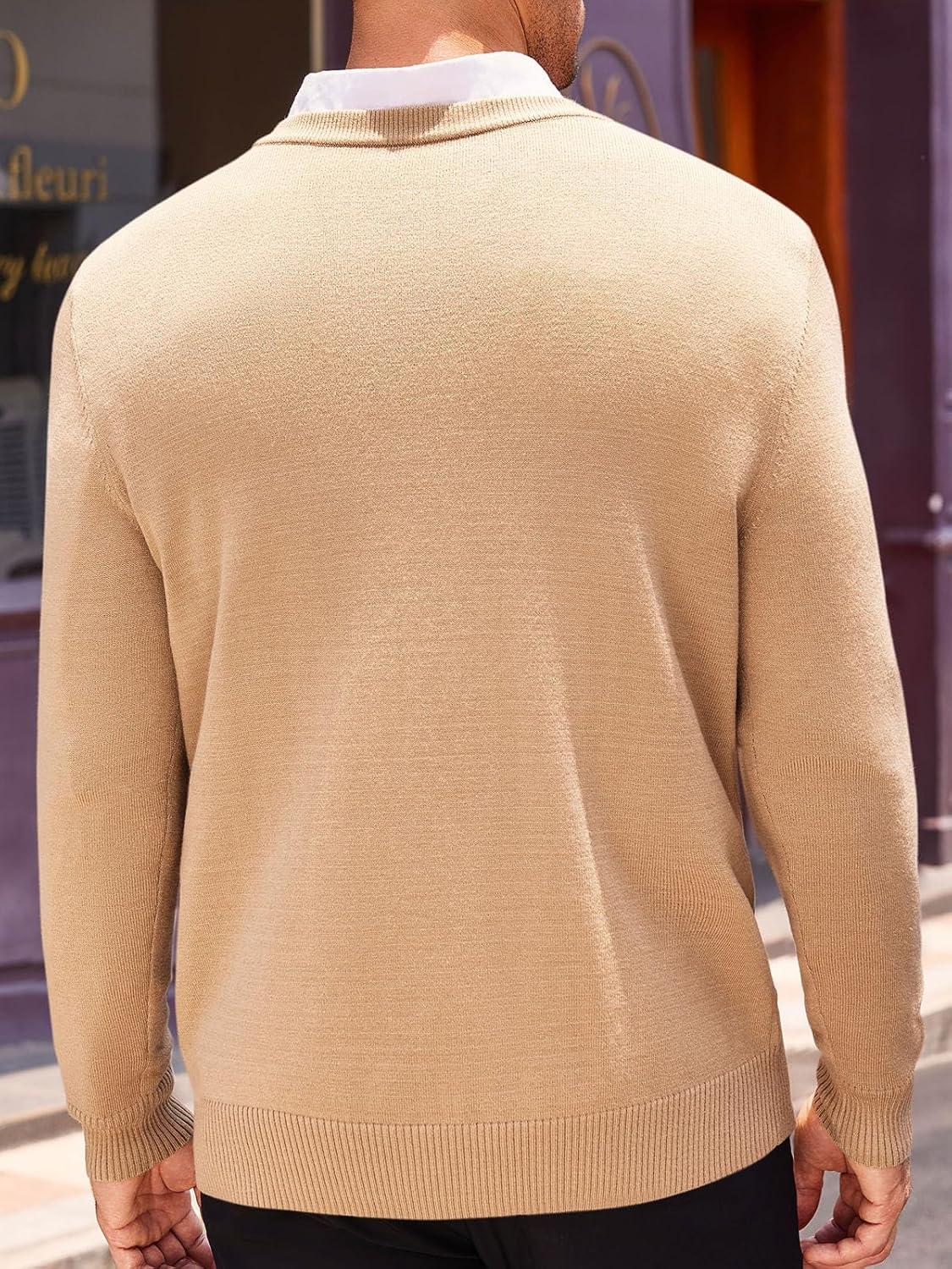 Runcati Mens Long Sleeve Polo Sweater Knit Polos V Neck Casual Dress Button Collared Pullover Sweaters(Beige)