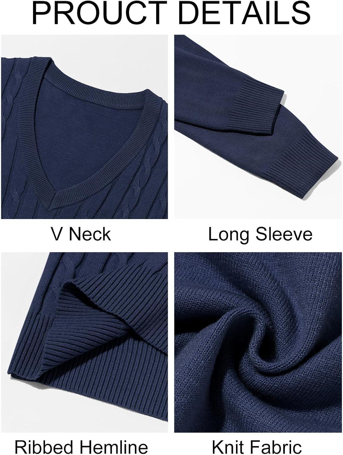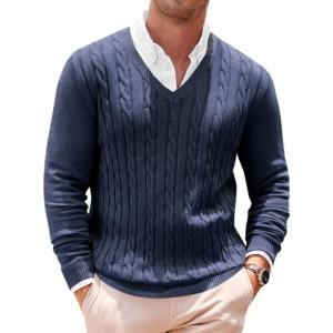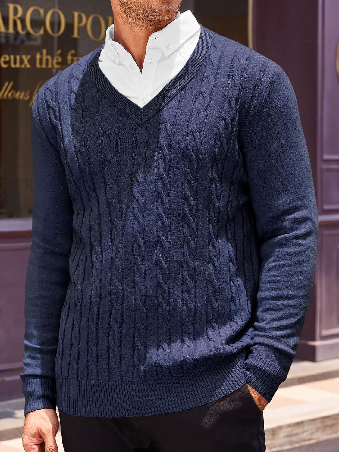 Runcati Mens V Neck Sweater Cable Knit Long Sleeve Casual Ribbed Twisted Pullover Sweaters(Navy Blue)