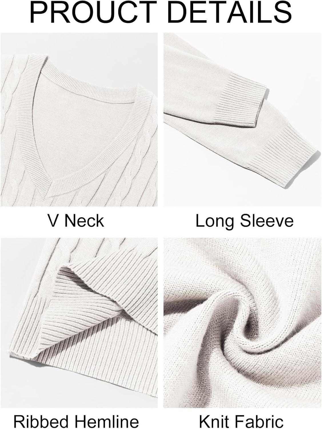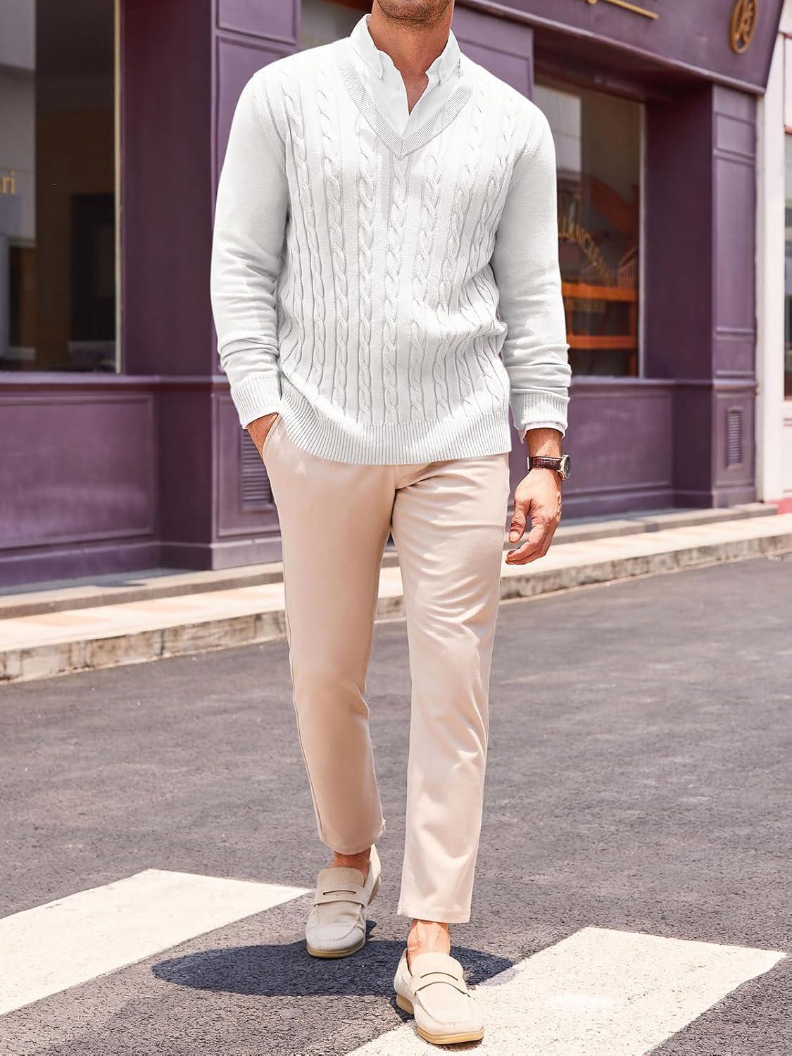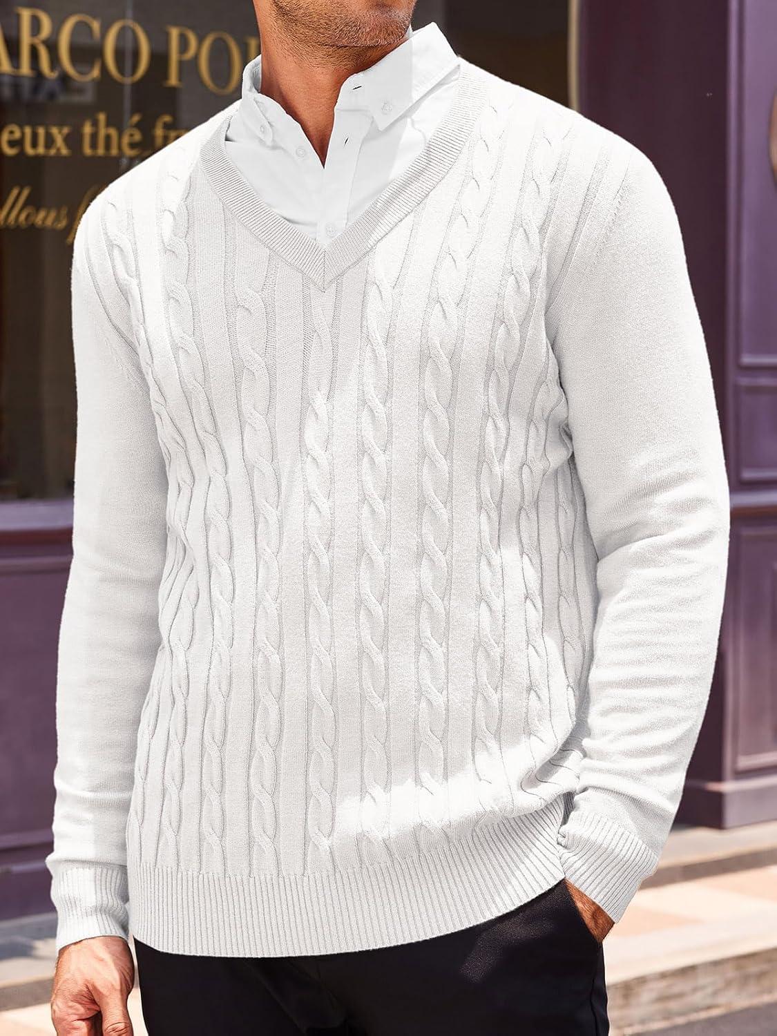 Runcati Mens V Neck Sweater Cable Knit Long Sleeve Casual Ribbed Twisted Pullover Sweaters(White)
