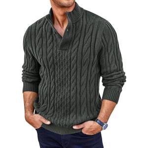Runcati Mens Cable Knit Pullover Sweater Casual Stand Collar Chunky Buttons Fall Winter Sweaters(Dark Grey)