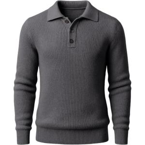 Runcati Mens Long Sleeve Polo Sweater Knit Polos V Neck Casual Dress Button Collared Pullover Sweaters(Dark Grey)