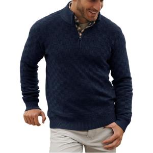 Runcati Mens Quarter Zip Pullover Sweater Casual Mock Neck Slim Fit Checkered Knitted Polo Sweaters(Navy Blue)