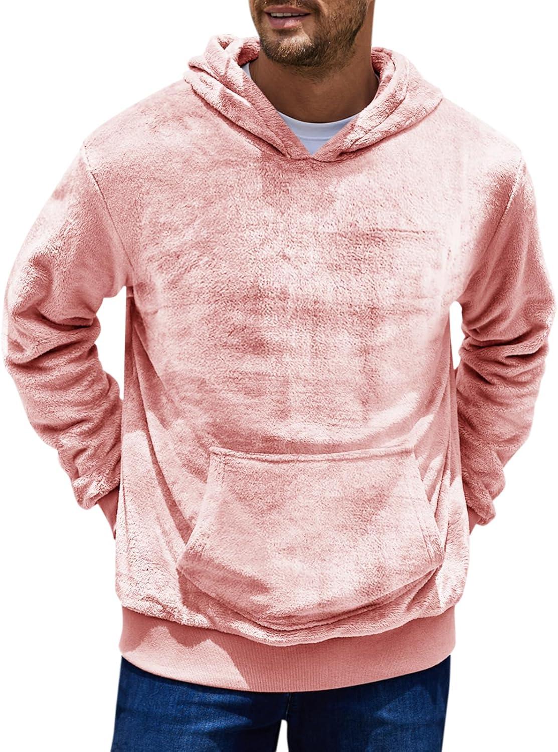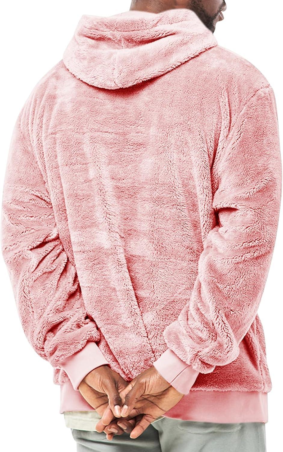 Runcati Mens Fuzzy Sherpa Pullover Hoodie Sweatshirts Long Sleeve Sport Front Pocket Military Fall Outwear Winter Hooded(02 Pink)