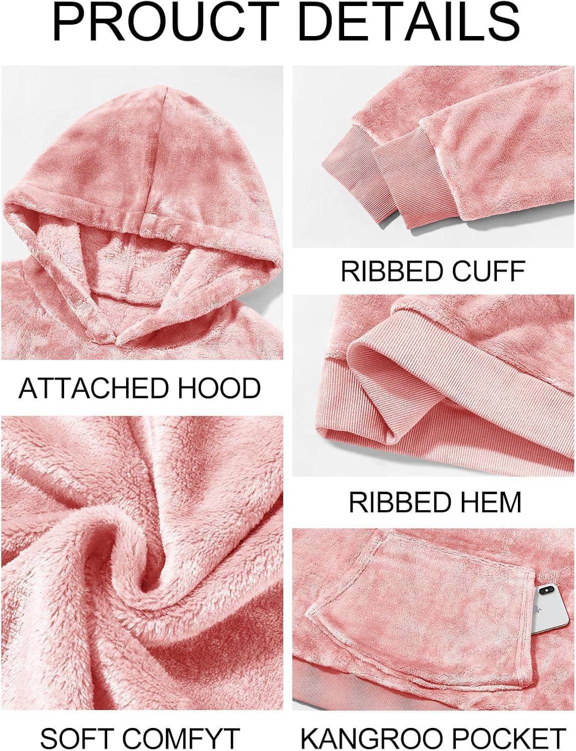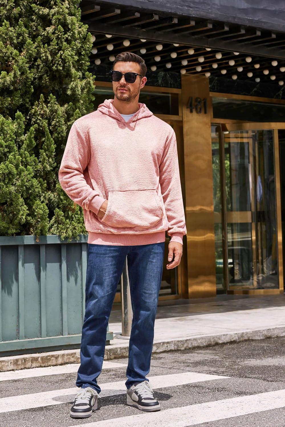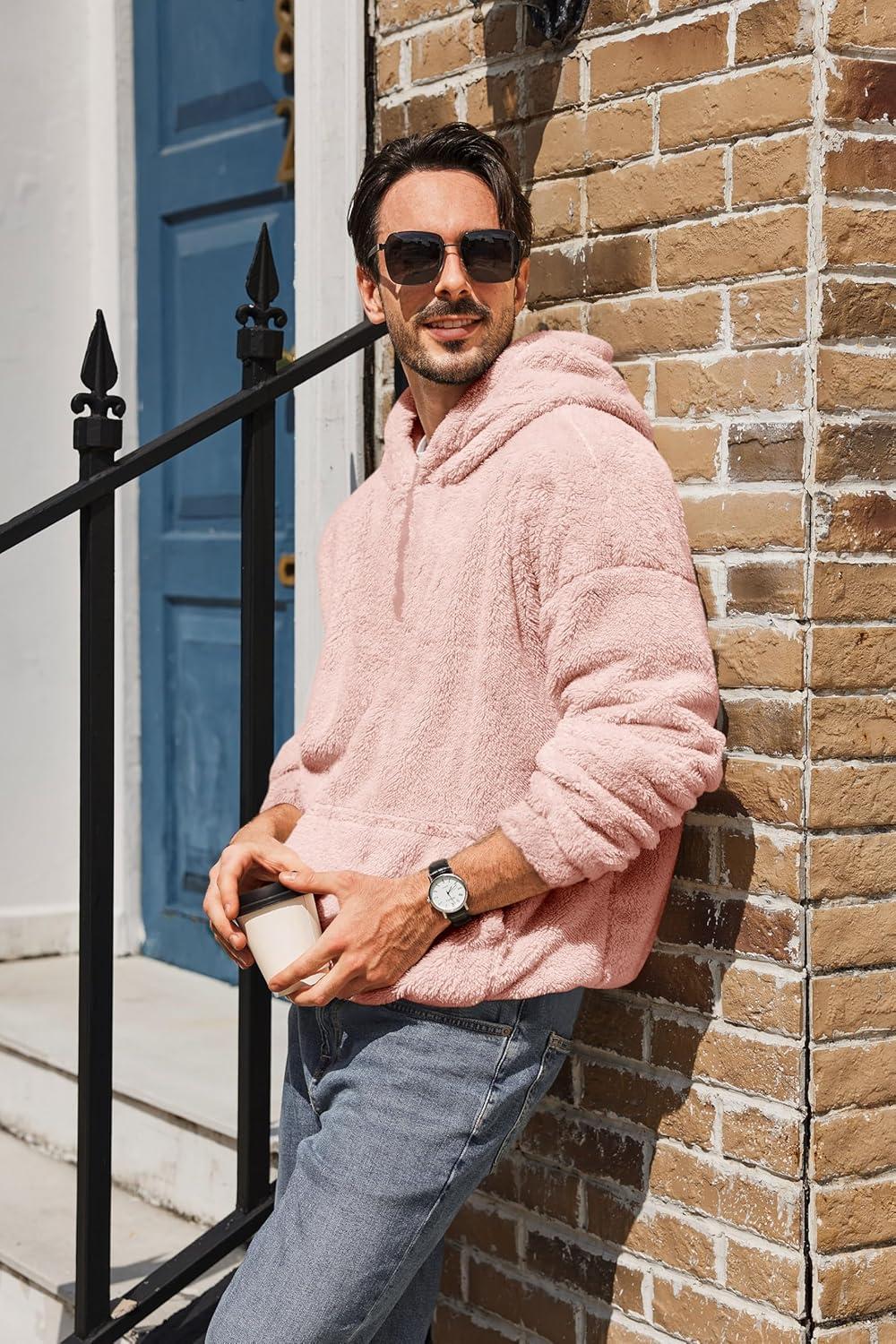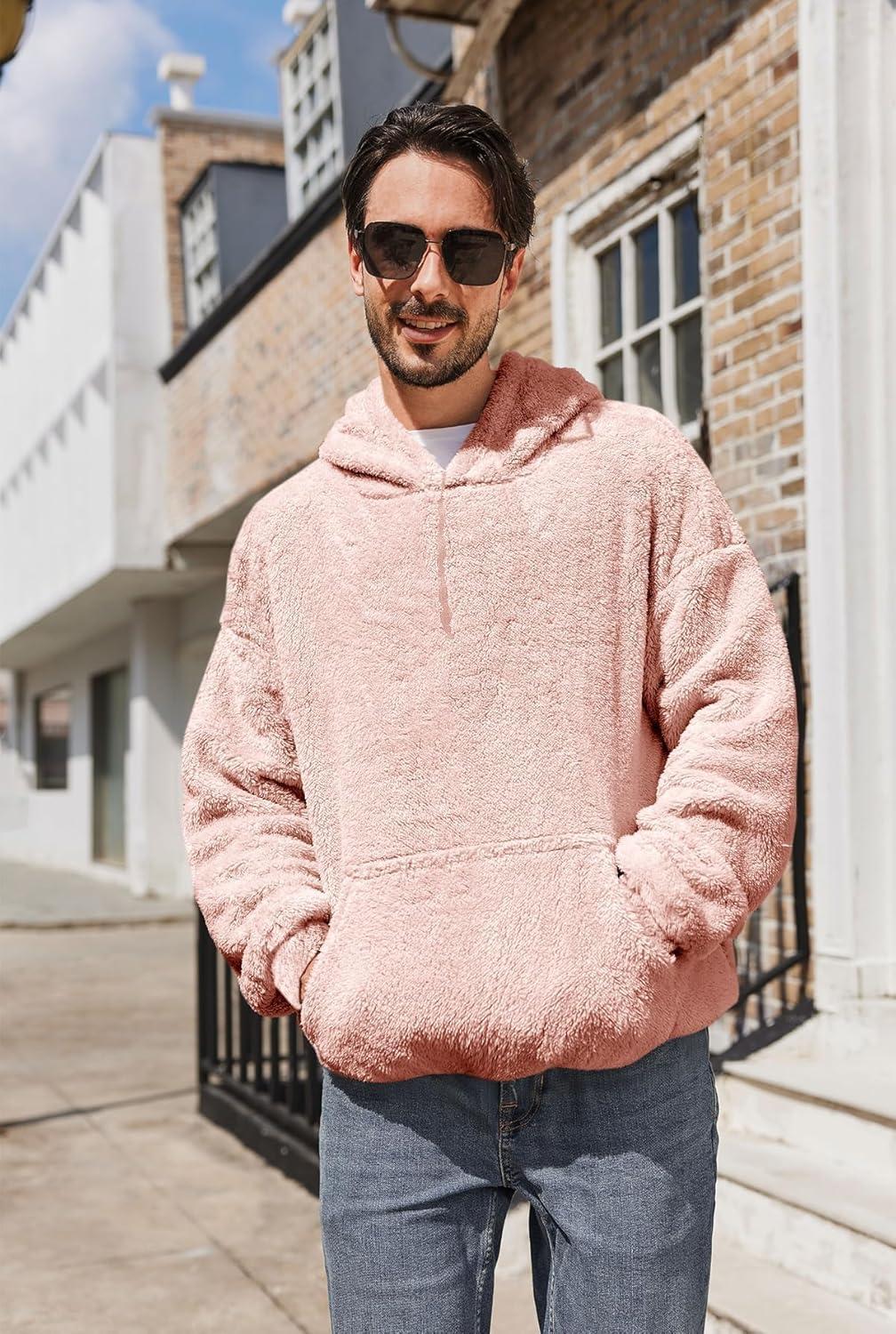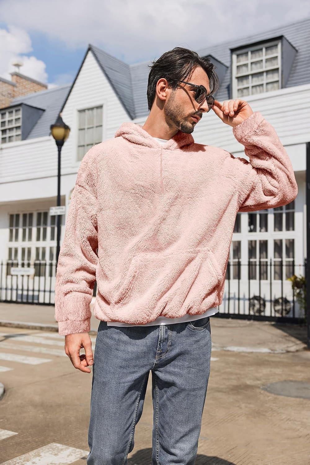 Runcati Mens Fuzzy Sherpa Pullover Hoodie Sweatshirts Long Sleeve Kangaroo Pocket Winter Fall Outwear Hooded(Pink)