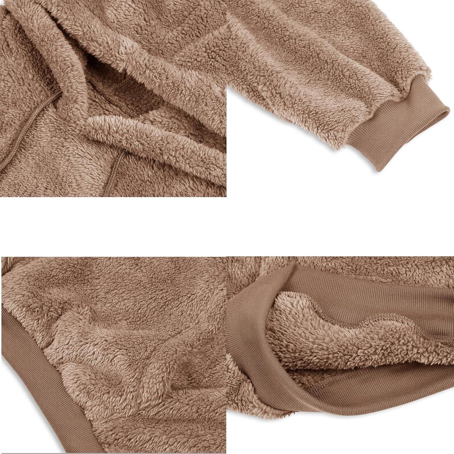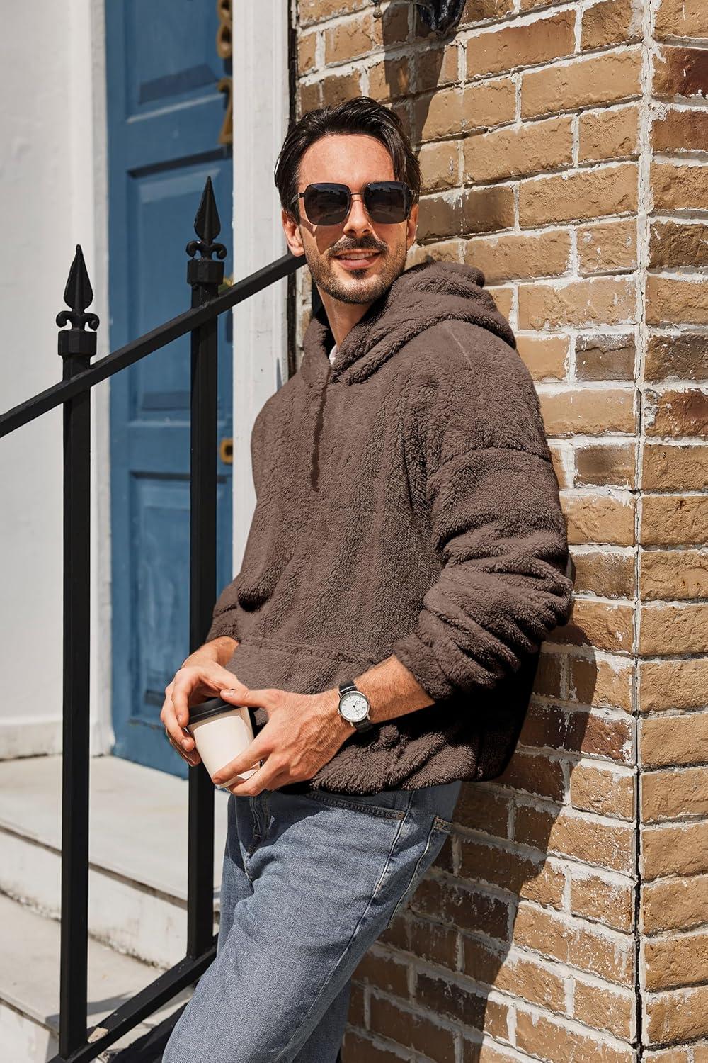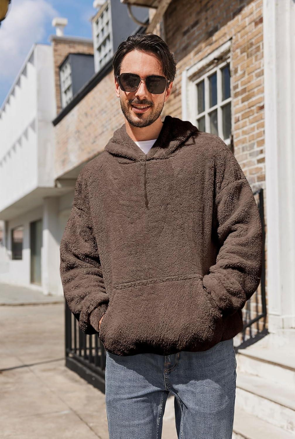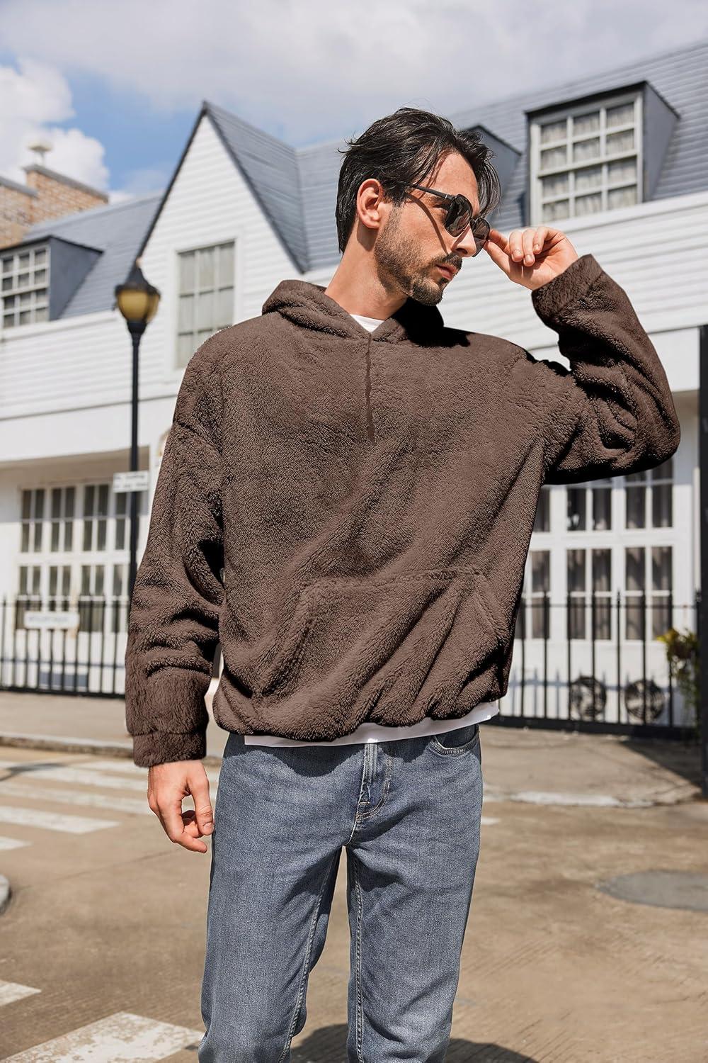 Runcati Mens Fuzzy Sherpa Pullover Hoodie Sweatshirts Long Sleeve Kangaroo Pocket Winter Fall Outwear Hooded(Brown)