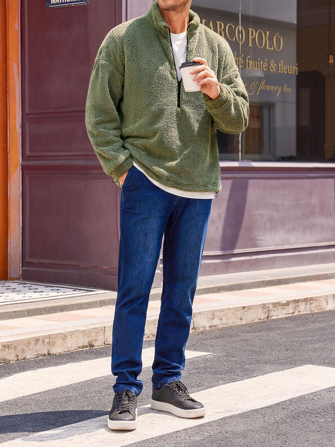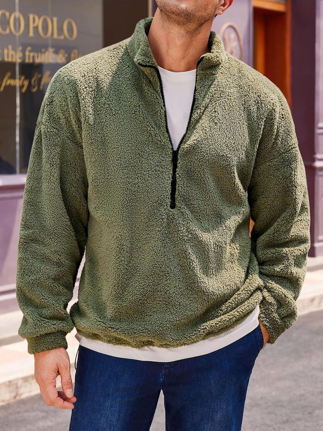 Runcati Mens Fuzzy Sherpa Sweatshirt Quarter Zip Pullover Long Sleeve Winter Fall Fleece Outwear(Army Green)