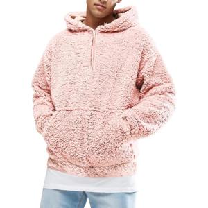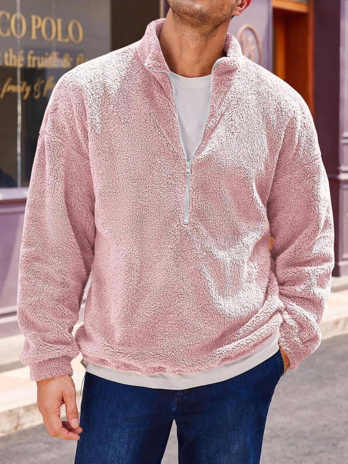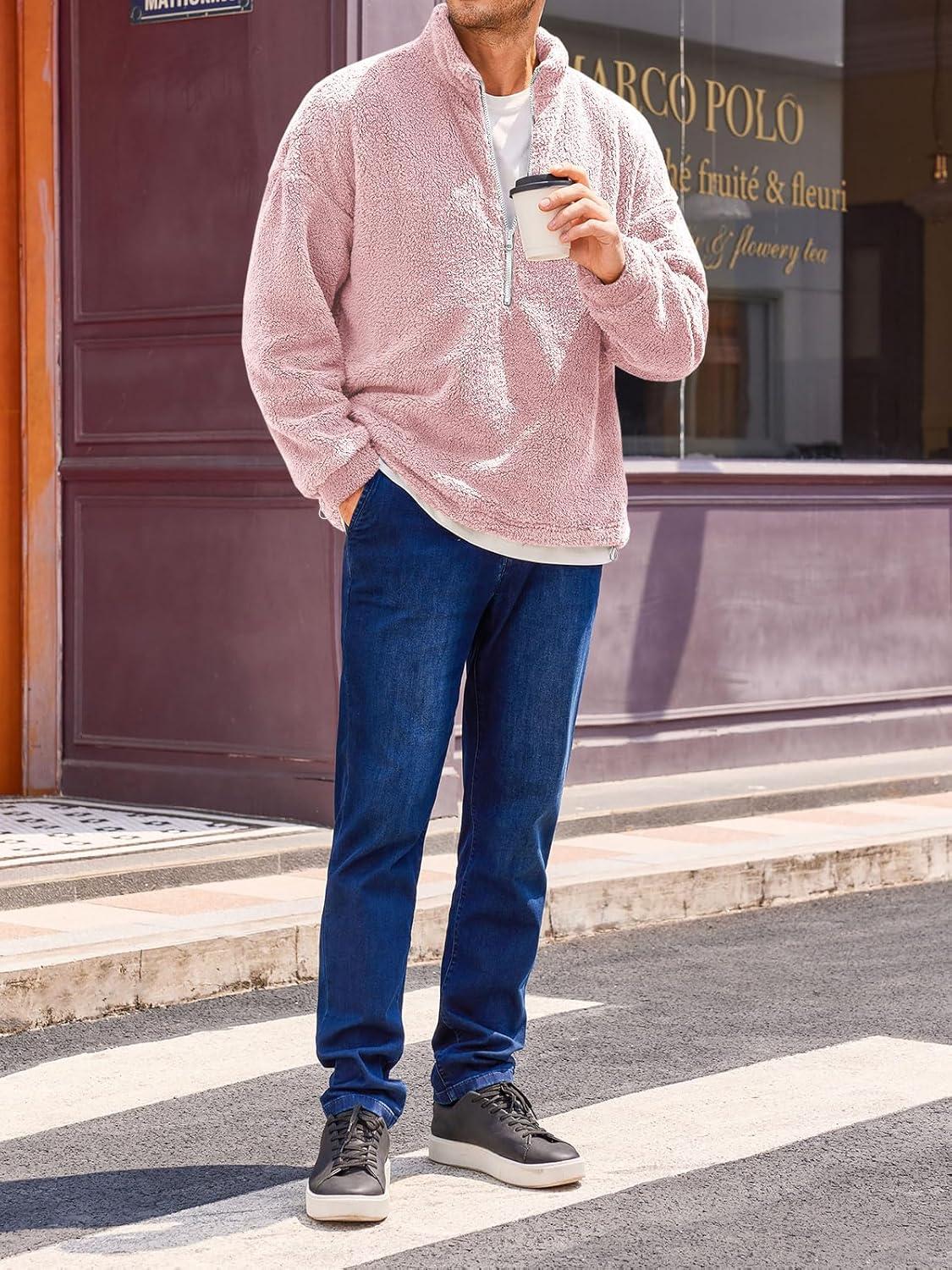 Runcati Mens Fuzzy Sherpa Sweatshirt Quarter Zip Pullover Long Sleeve Winter Fall Fleece Outwear(Pink)