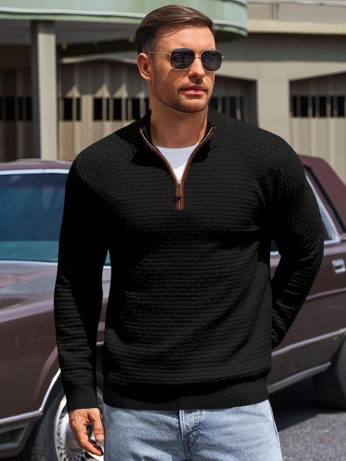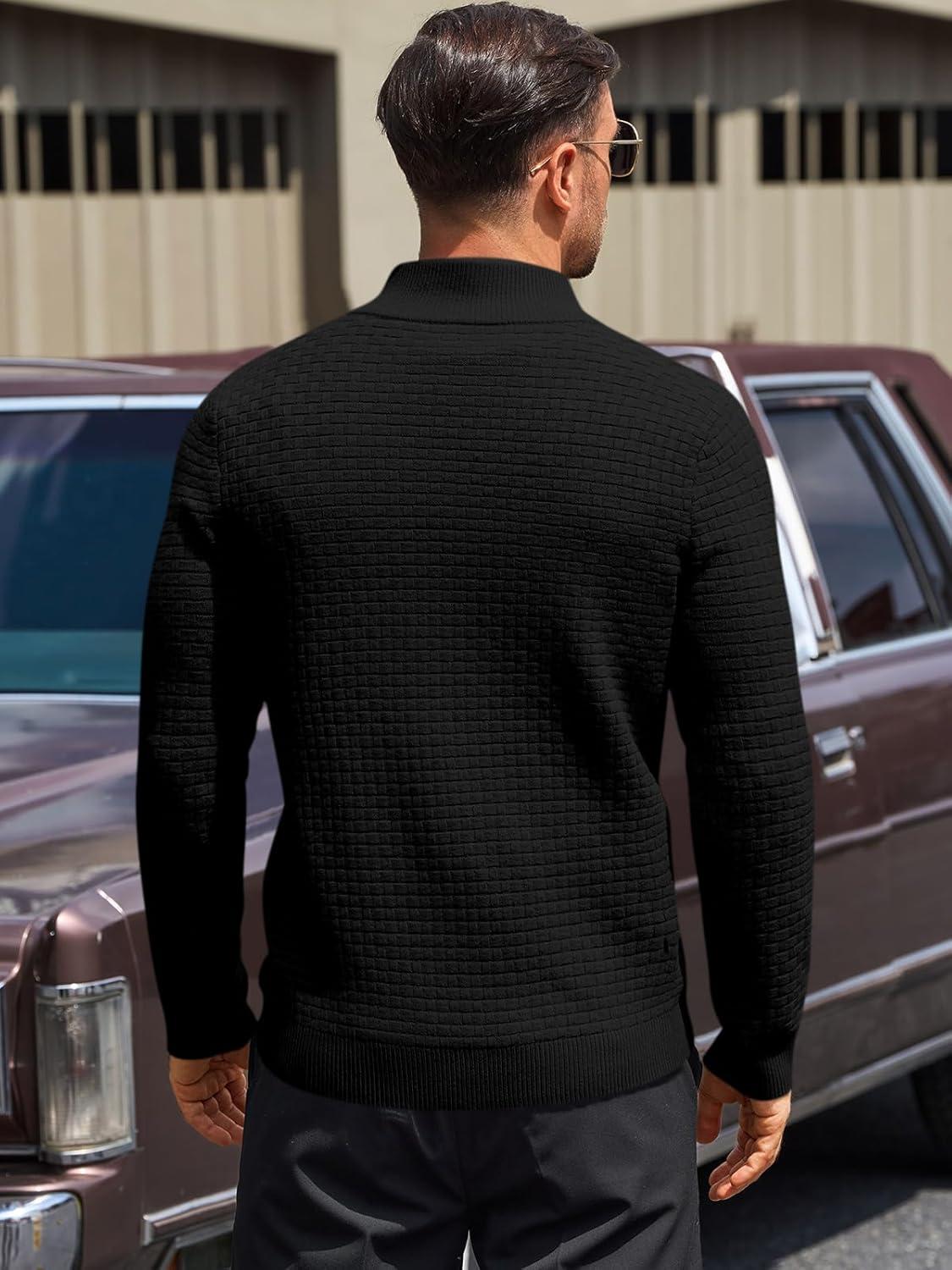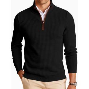 Runcati Mens Quarter Zip Pullover Sweaters Mock Neck Slim Fit Lightweight Pullover Waffle Knit Casual Polo Sweater(Black)