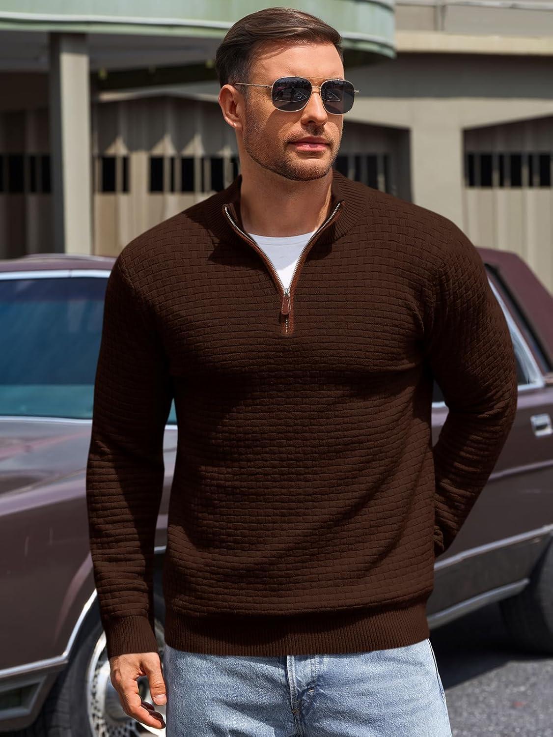 Runcati Mens Quarter Zip Pullover Sweaters Mock Neck Slim Fit Lightweight Pullover Waffle Knit Casual Polo Sweater(Coffee)