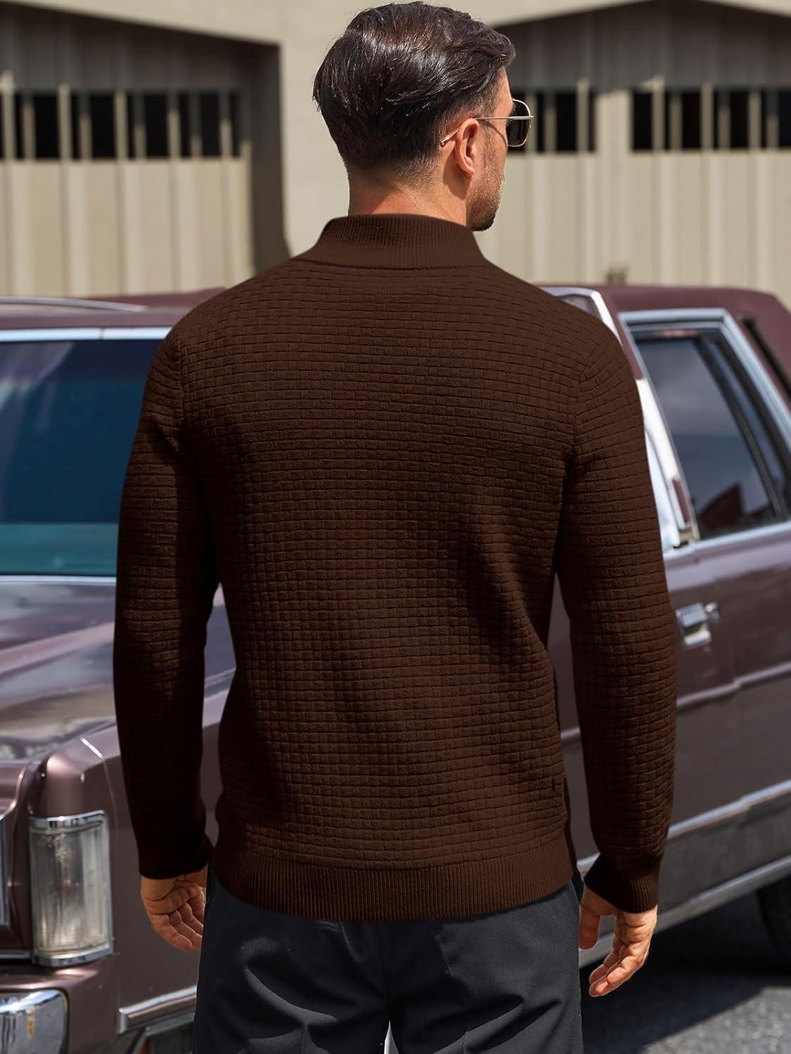 Runcati Mens Quarter Zip Pullover Sweaters Mock Neck Slim Fit Lightweight Pullover Waffle Knit Casual Polo Sweater(Dark Brown)