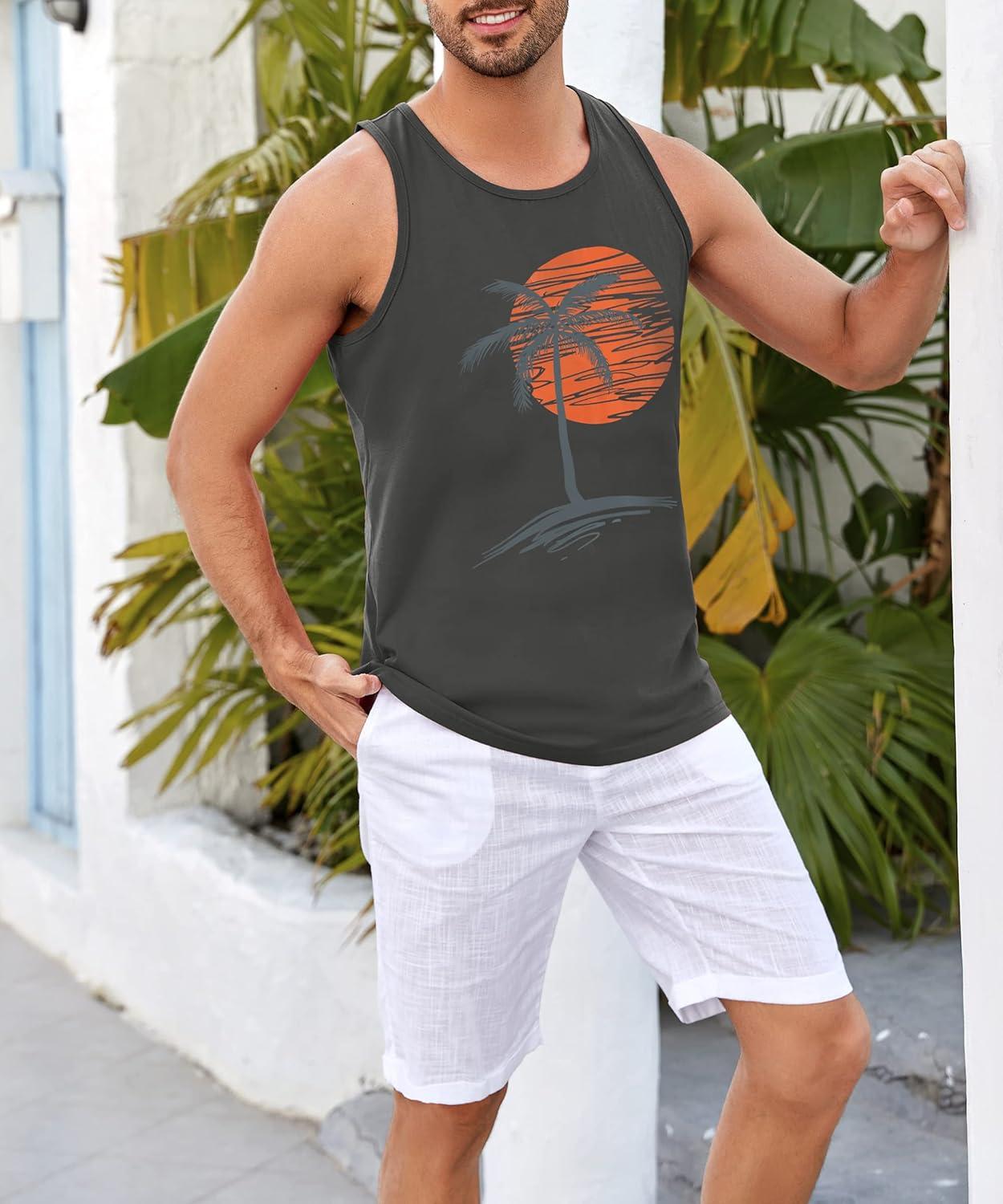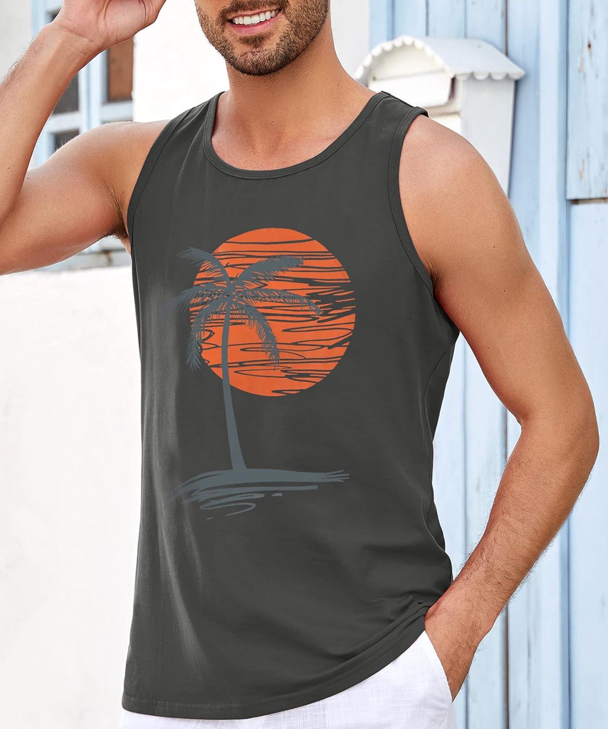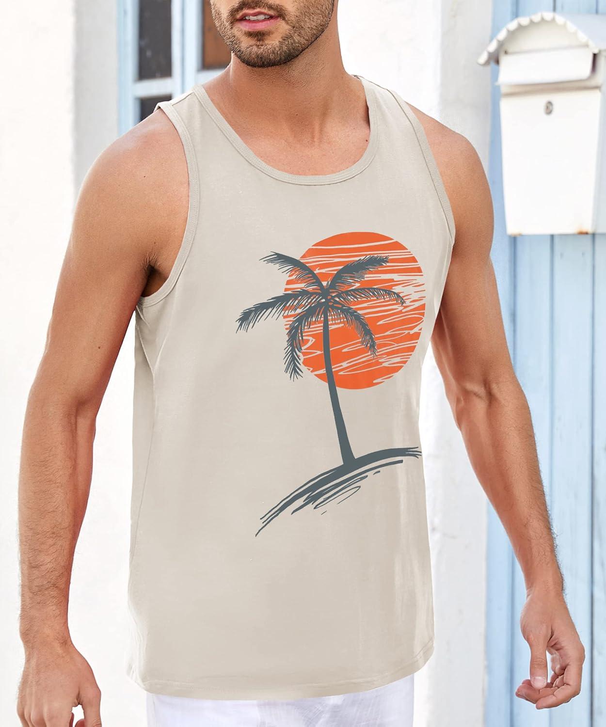 Runcati Mens Workout Tank Tops Gym Sleeveless Shirts Palm Tree Vintage Style T-Shirt(Light Grey)