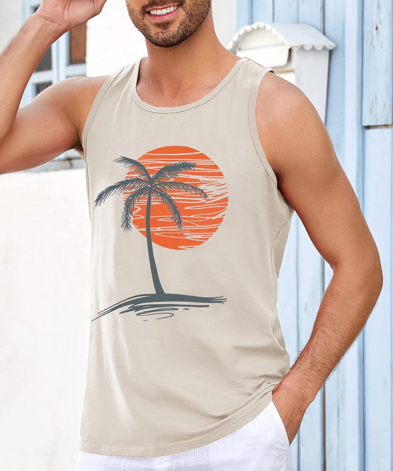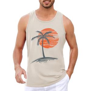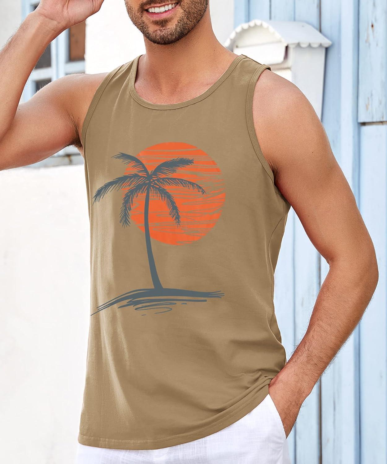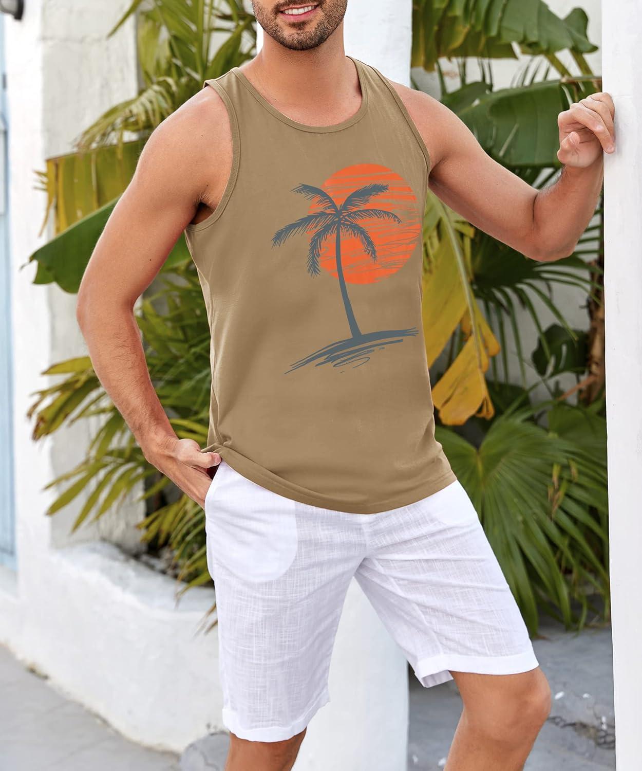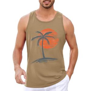 Runcati Mens Workout Tank Tops Gym Sleeveless Shirts Palm Tree Vintage Style T-Shirt(Khaki)
