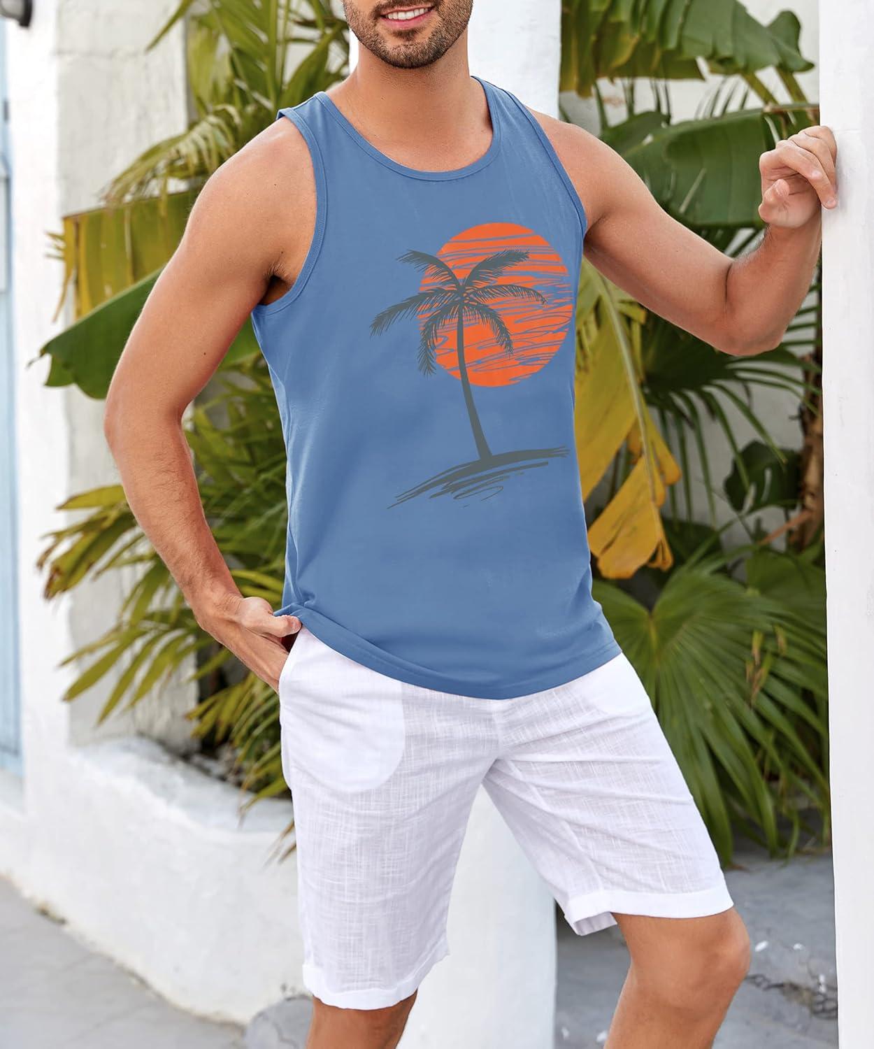 Runcati Mens Workout Tank Tops Gym Sleeveless Shirts Palm Tree Vintage Style T-Shirt(Light Blue)