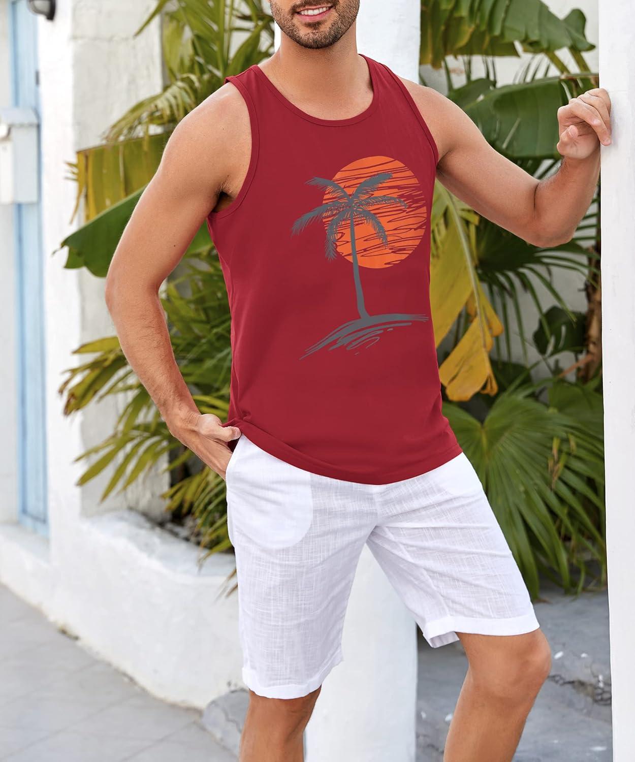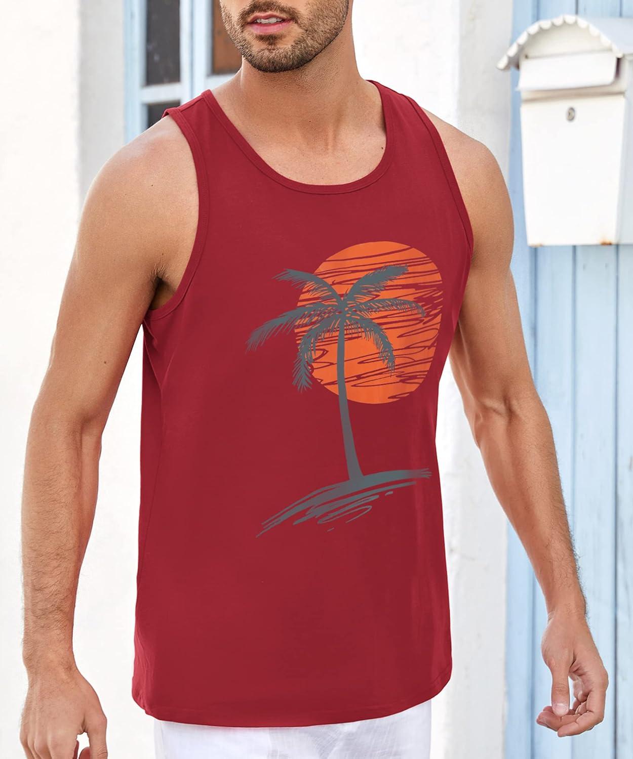 Runcati Mens Workout Tank Tops Gym Sleeveless Shirts Palm Tree Vintage Style T-Shirt(Red)