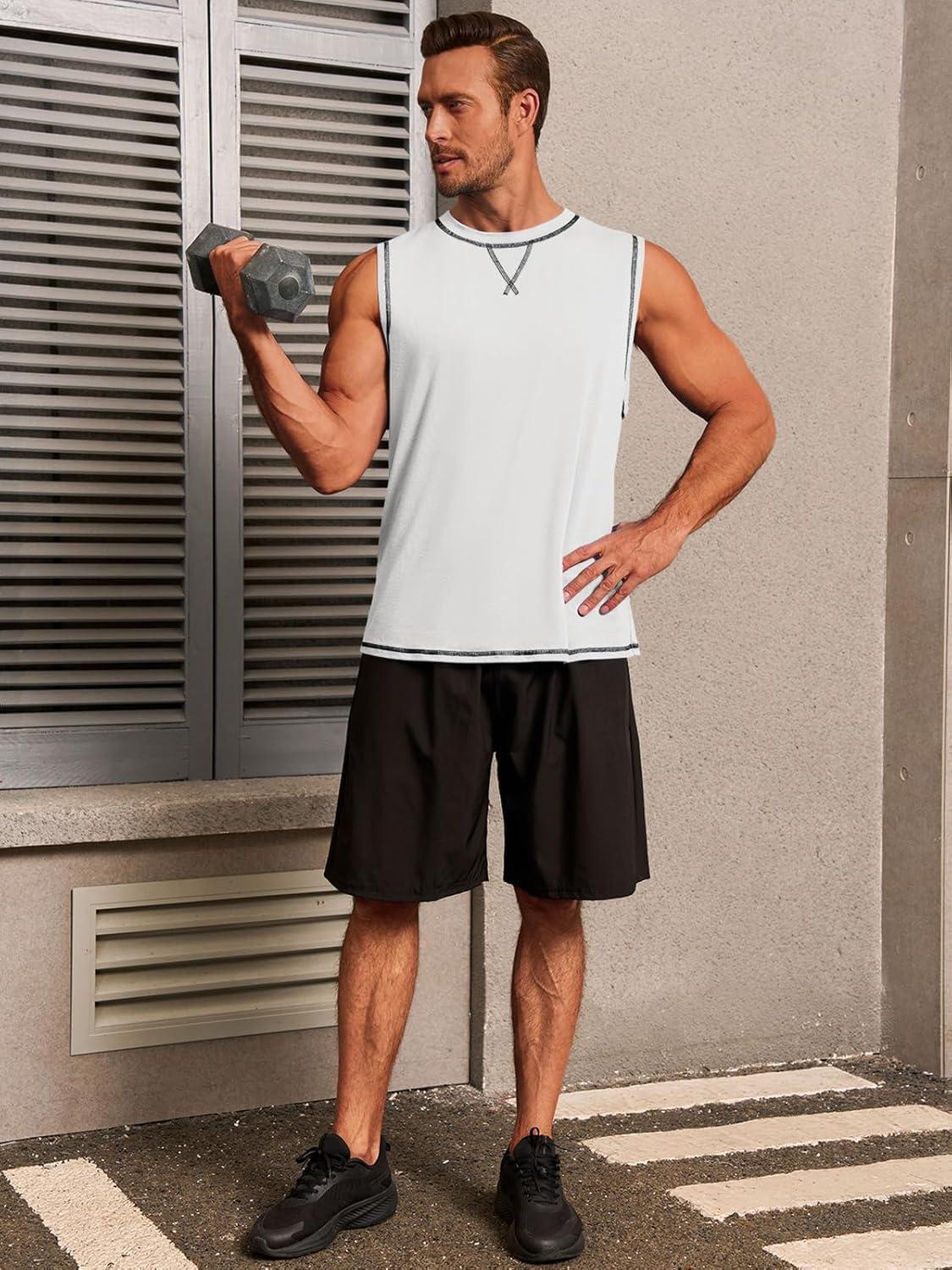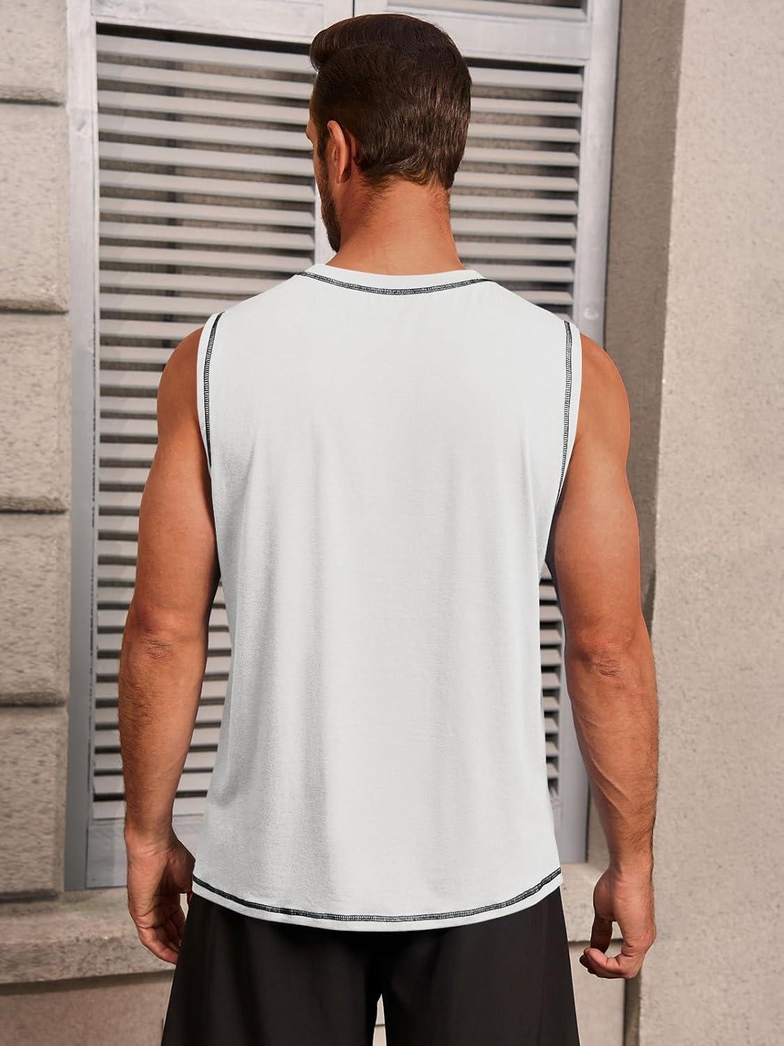 Runcati Mens Workout Tank Tops Sleeveless Casual Crewneck Beach T Shirt Muscle Athletic Gym Running Tee(White)