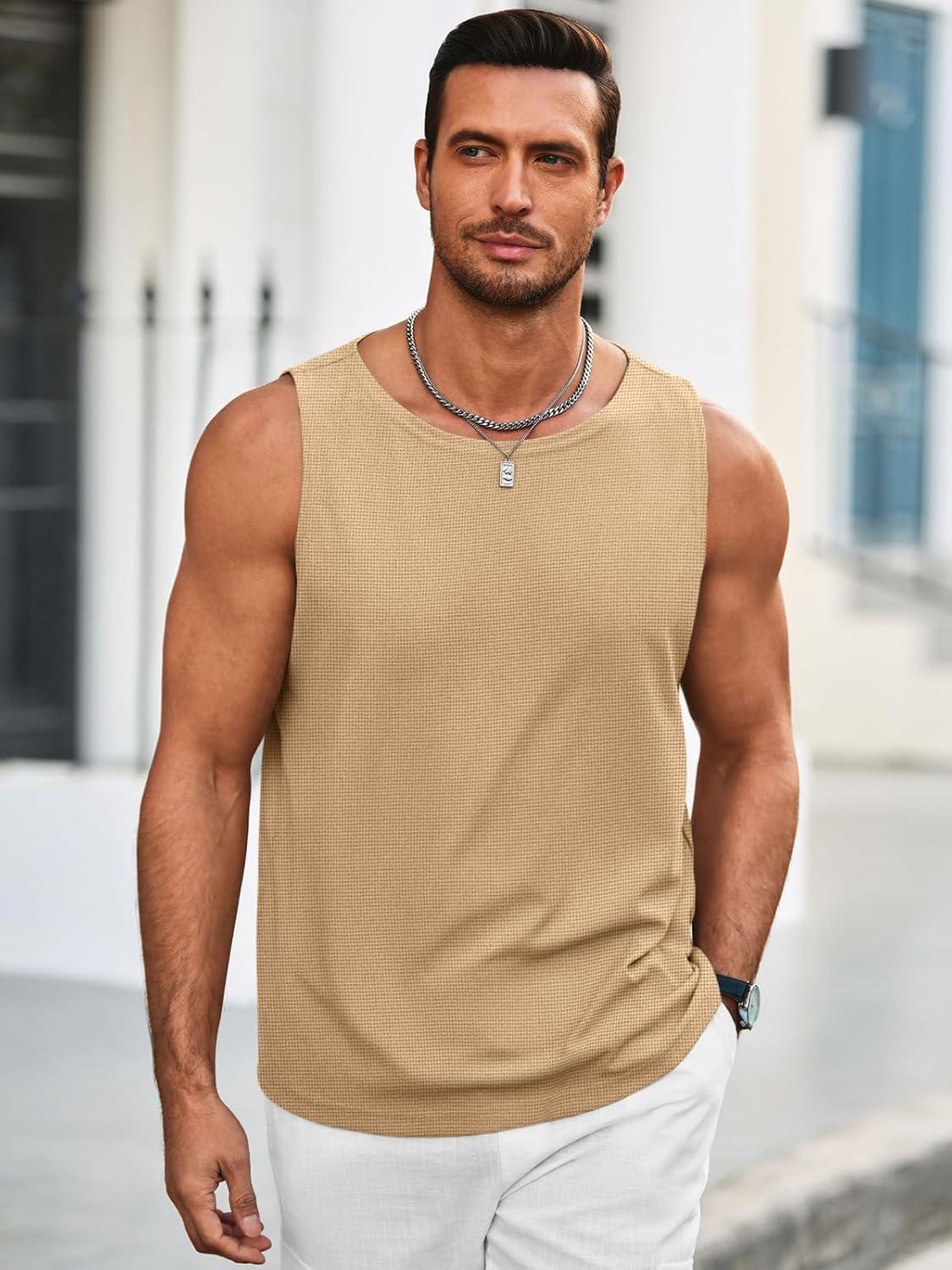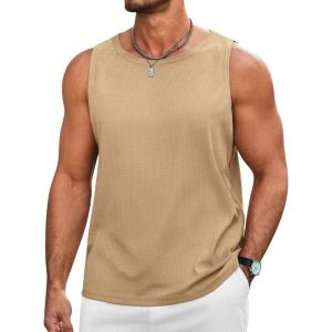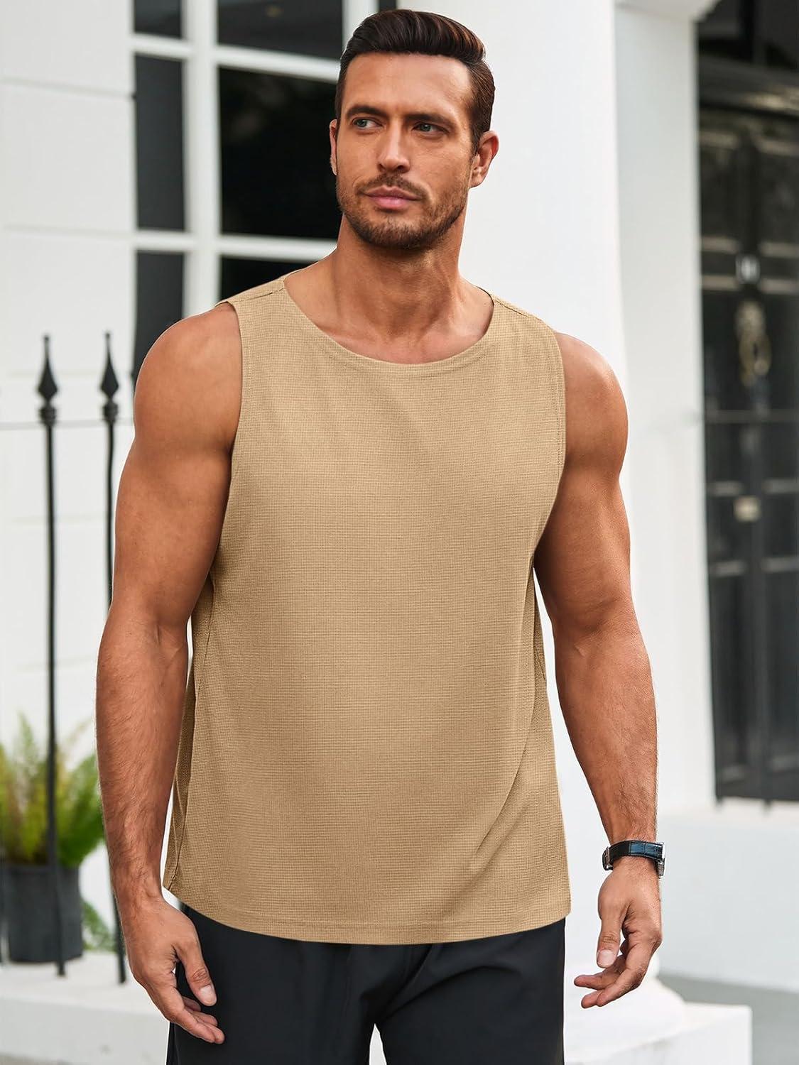 Runcati Mens Workout Tank Tops Sleeveless Casual Waffle T Shirts Gym Muscle Summer Beach Tee Shirt(Khaki)