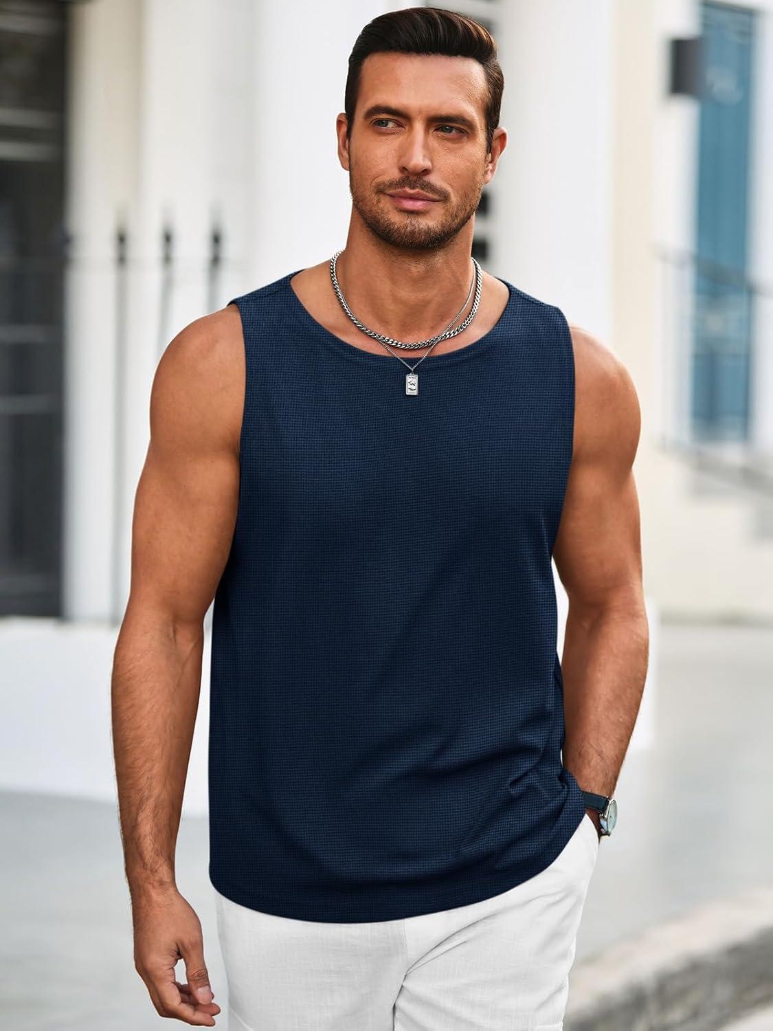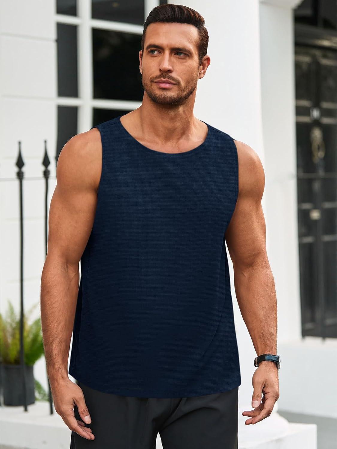 Runcati Mens Workout Tank Tops Sleeveless Casual Waffle T Shirts Gym Muscle Summer Beach Tee Shirt(Navy Blue)