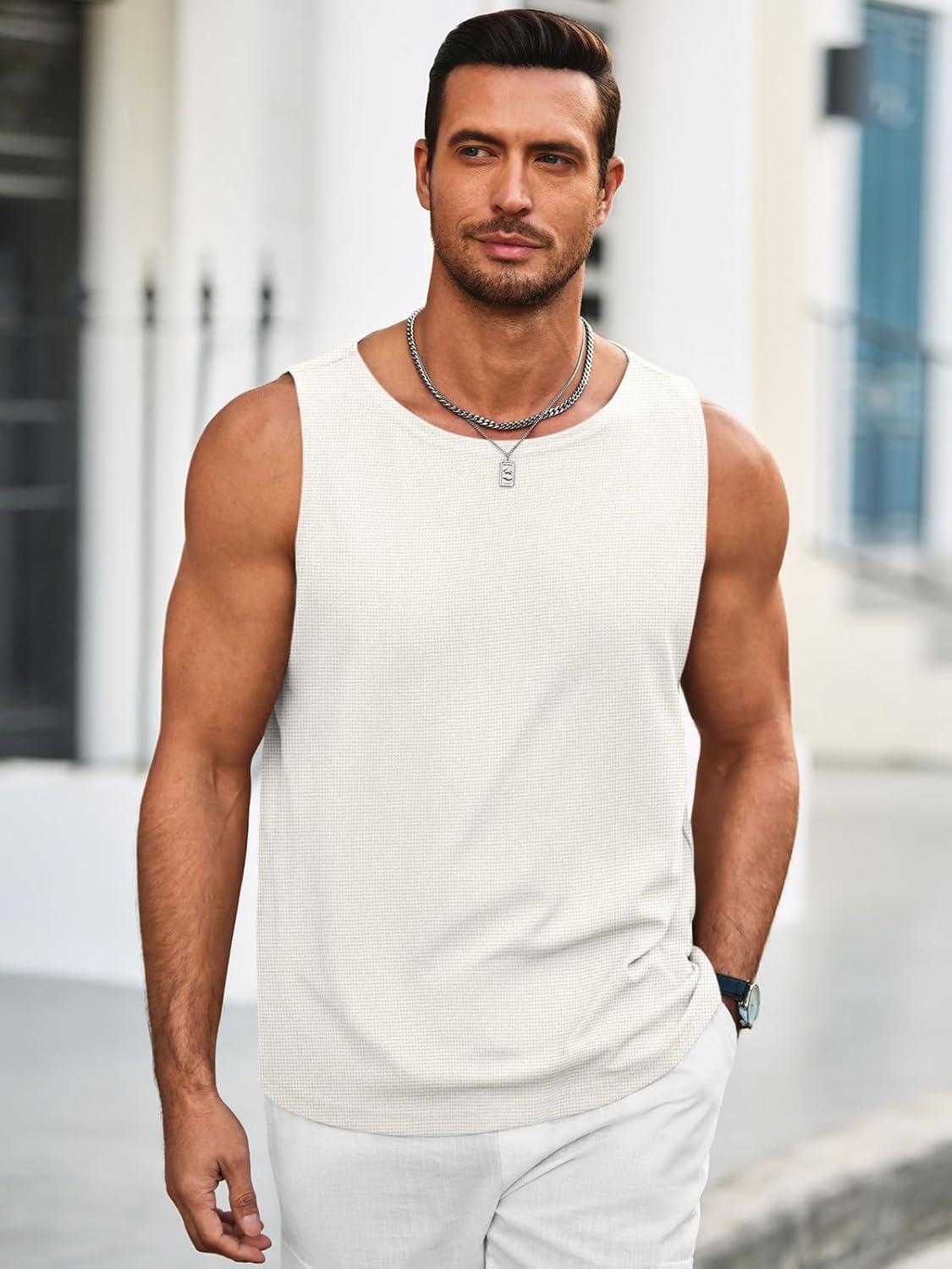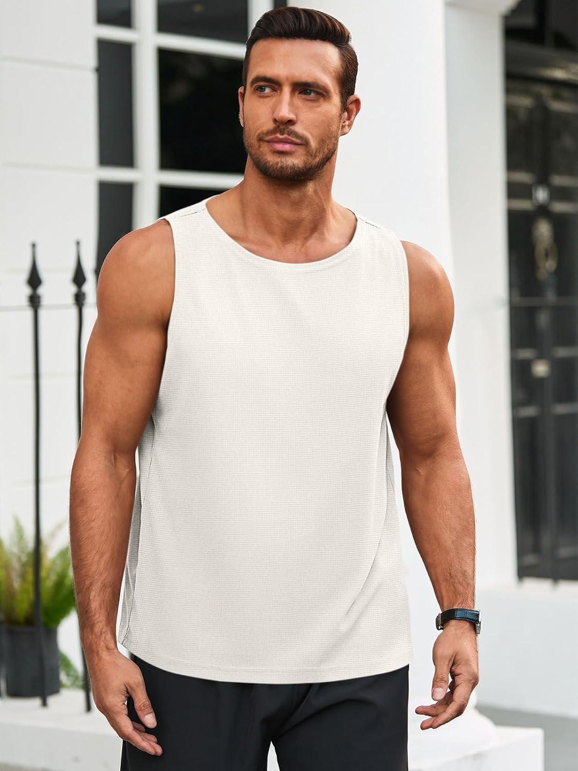 Runcati Mens Workout Tank Tops Sleeveless Casual Waffle T Shirts Gym Muscle Summer Beach Tee Shirt(White)