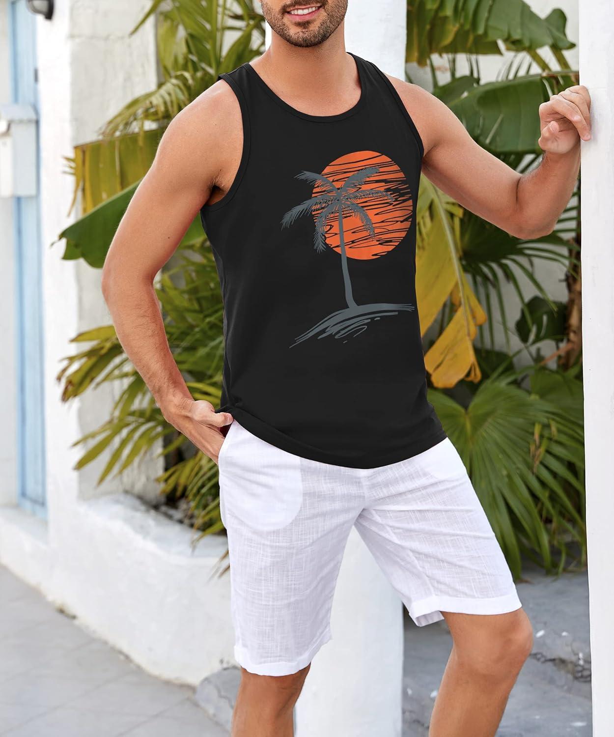 Runcati Mens Workout Tank Tops Gym Sleeveless Shirts Palm Tree Vintage Style T-Shirt(Black)