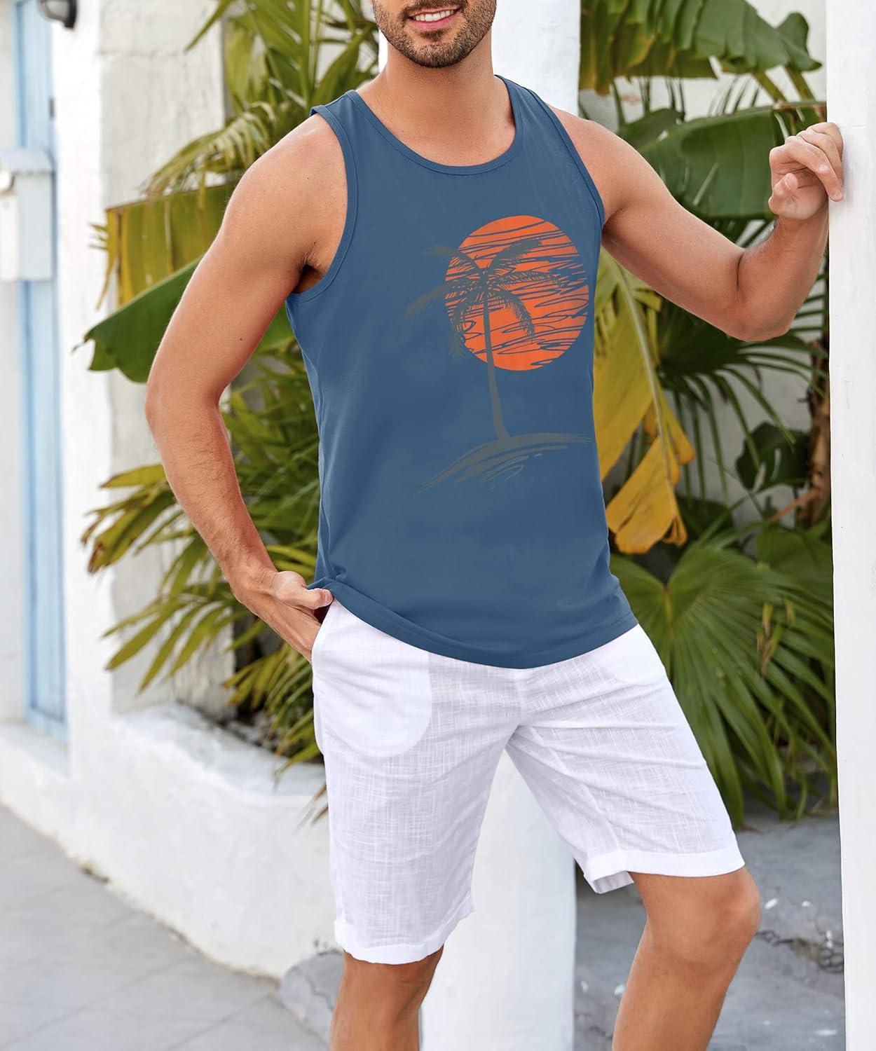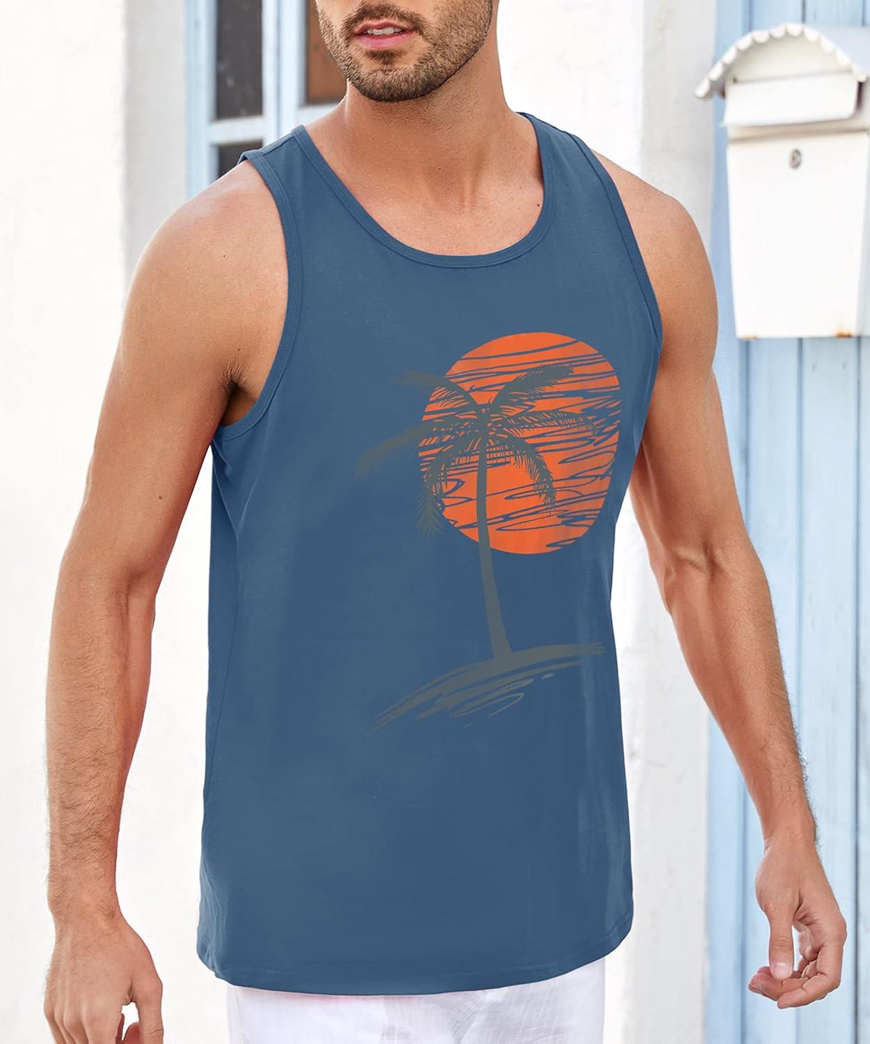 Runcati Mens Workout Tank Tops Gym Sleeveless Shirts Palm Tree Vintage Style T-Shirt(Blue)