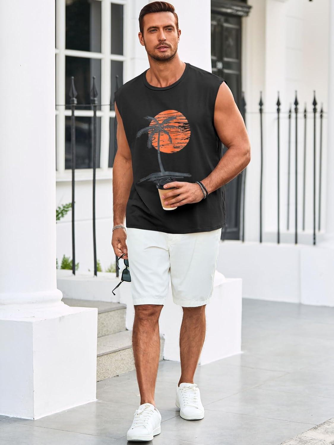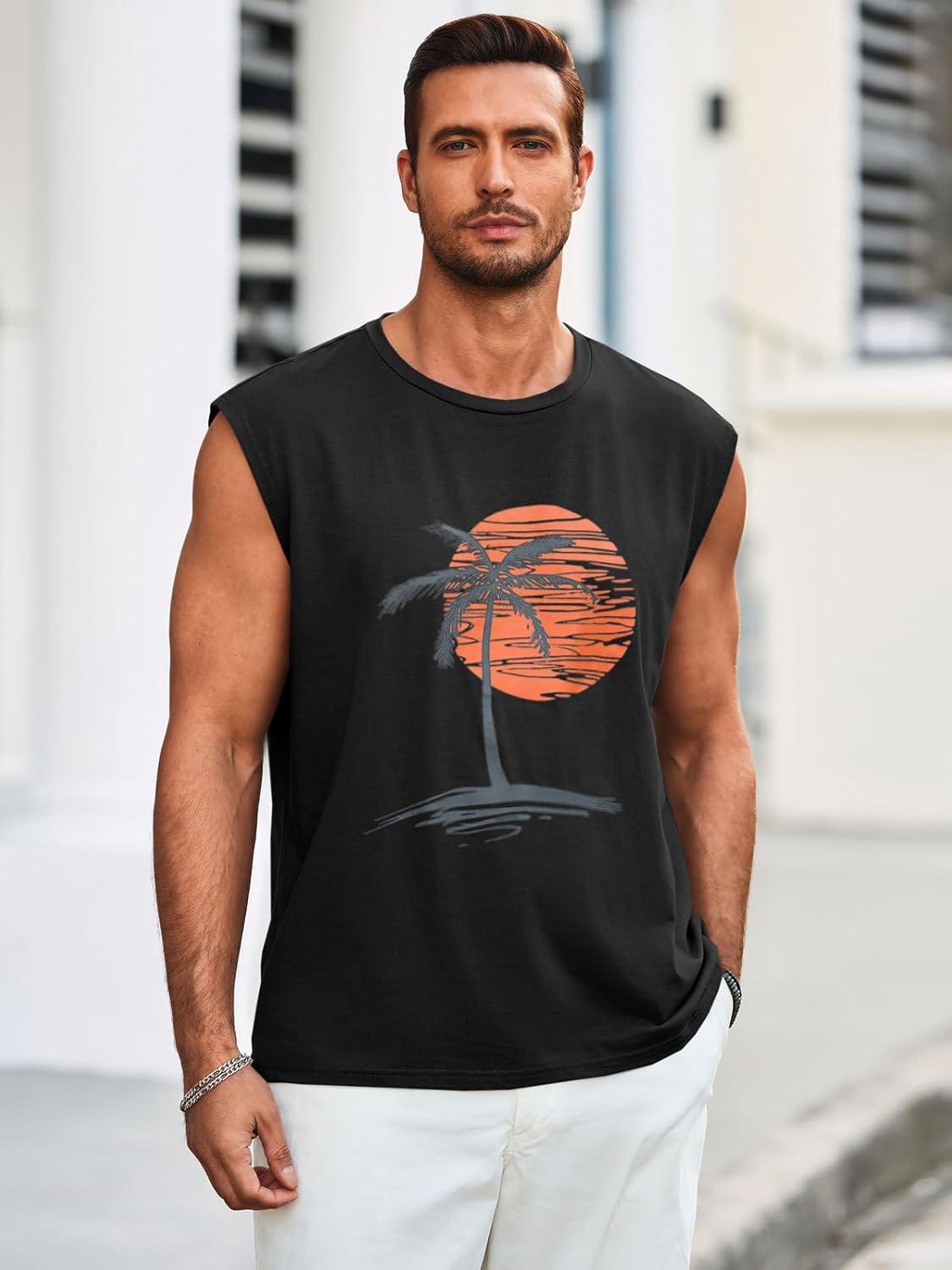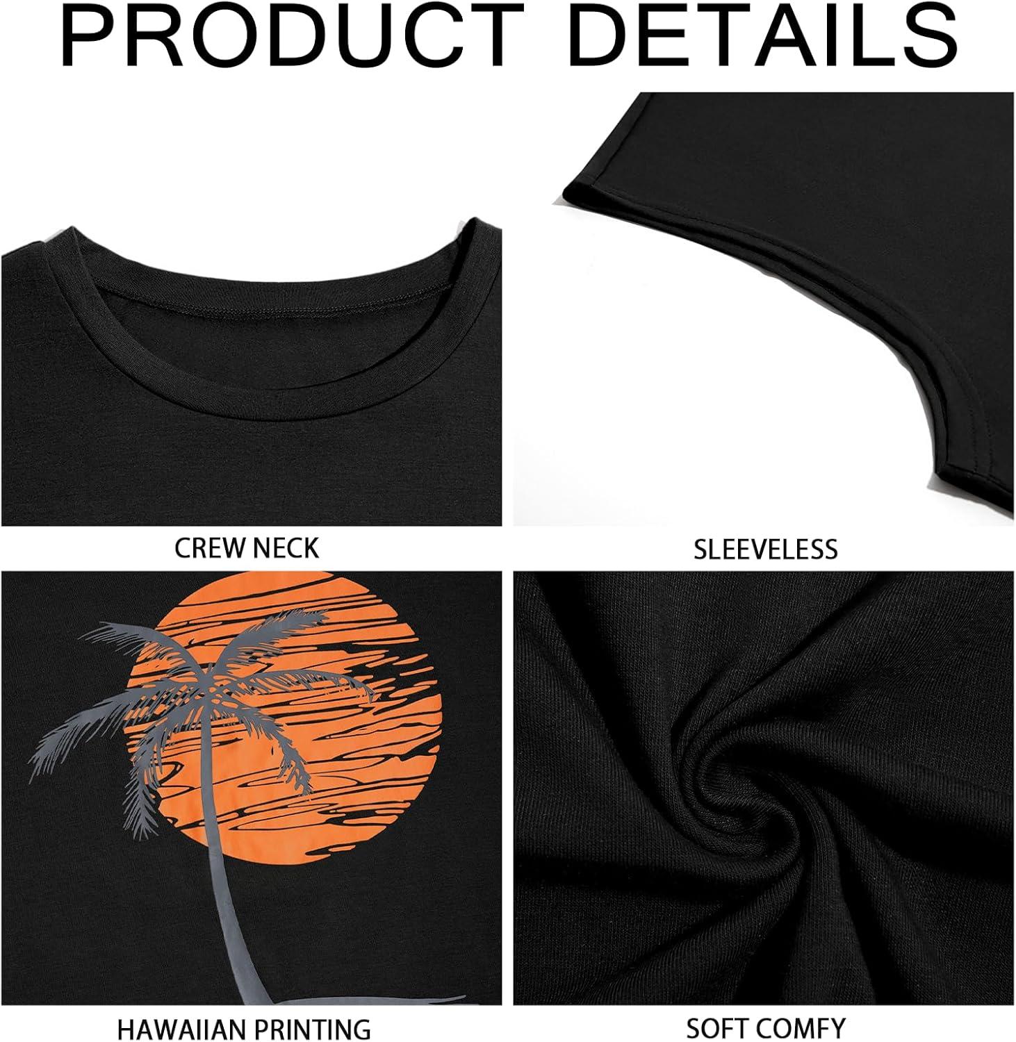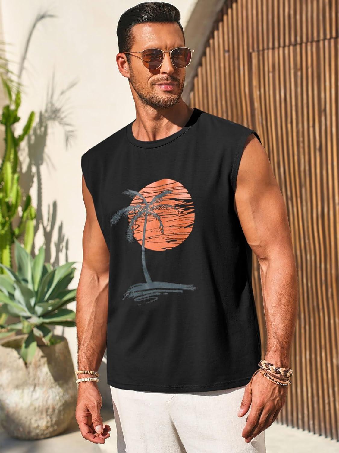 Runcati Mens Sleeveless Tank Tops Workout Gym Muscle Shirts Palm Tree Vintage Hawaiian Summer Beach T Shirts(Black)