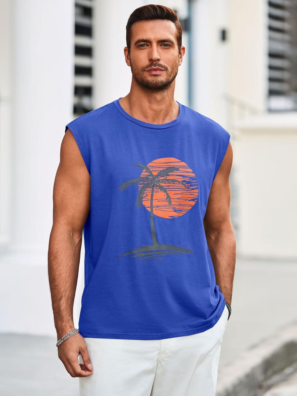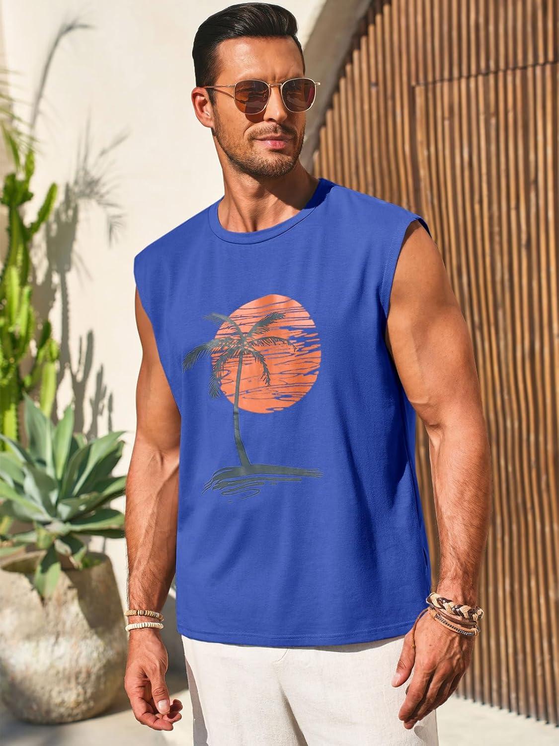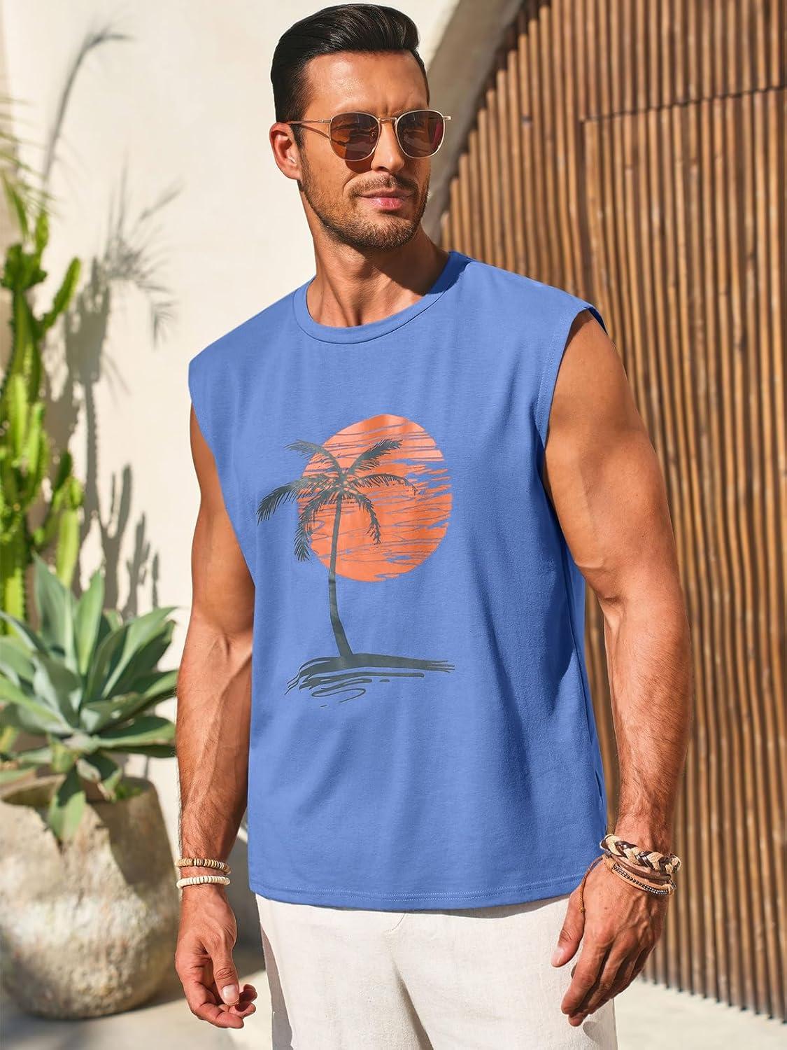 Runcati Mens Sleeveless Tank Tops Workout Gym Muscle Shirts Palm Tree Vintage Hawaiian Summer Beach T Shirts(Blue)