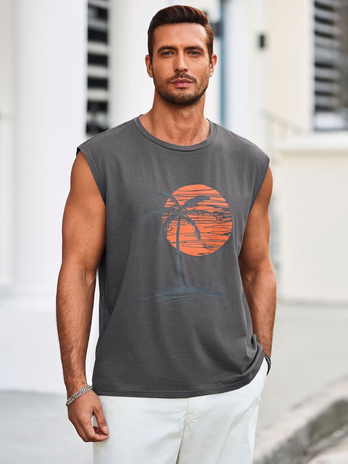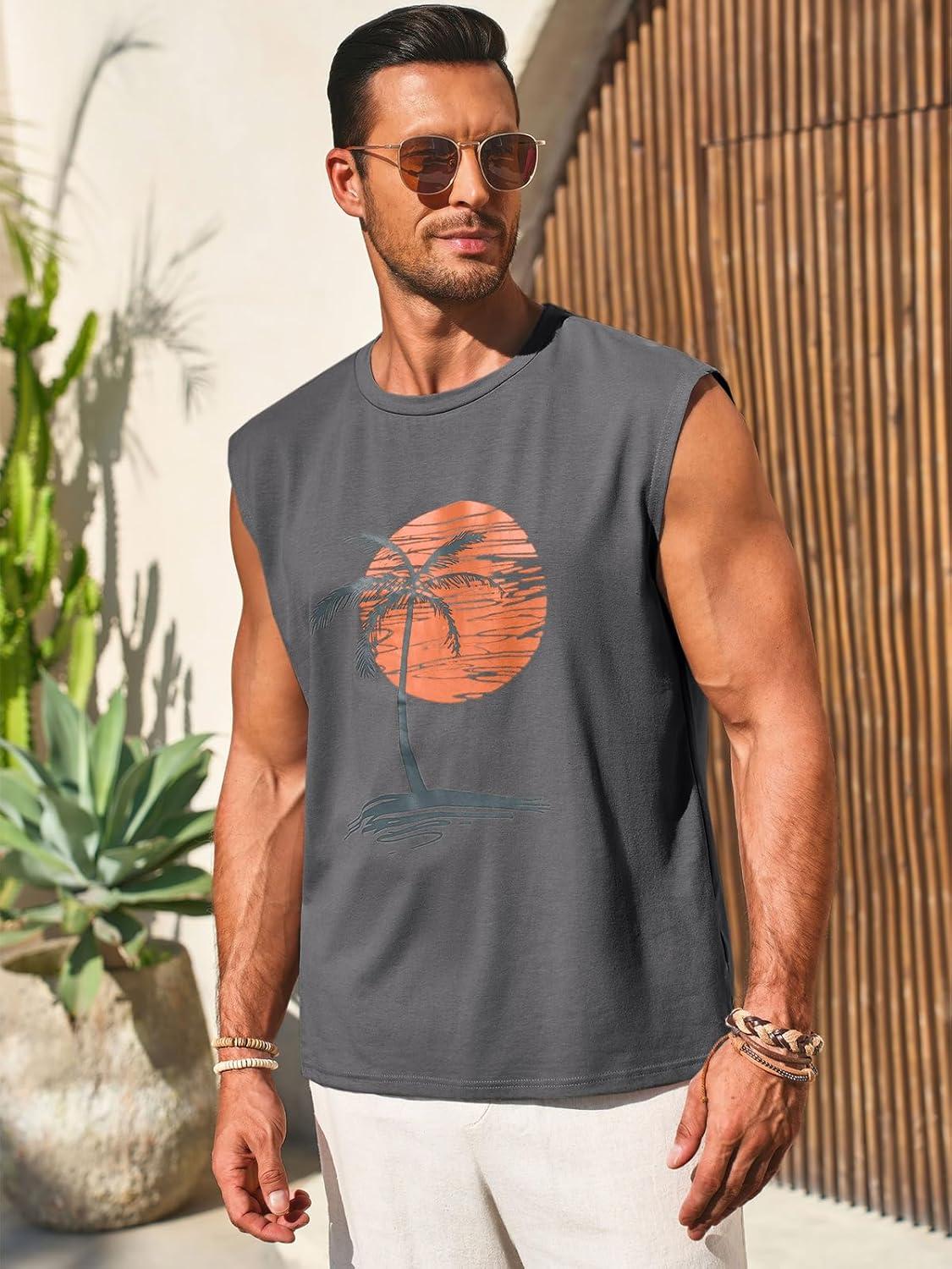 Runcati Mens Sleeveless Tank Tops Workout Gym Muscle Shirts Palm Tree Vintage Hawaiian Summer Beach T Shirts(Dark Gray)