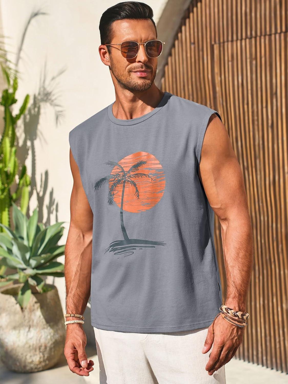 Runcati Mens Sleeveless Tank Tops Workout Gym Muscle Shirts Palm Tree Vintage Hawaiian Summer Beach T Shirts(Gray)