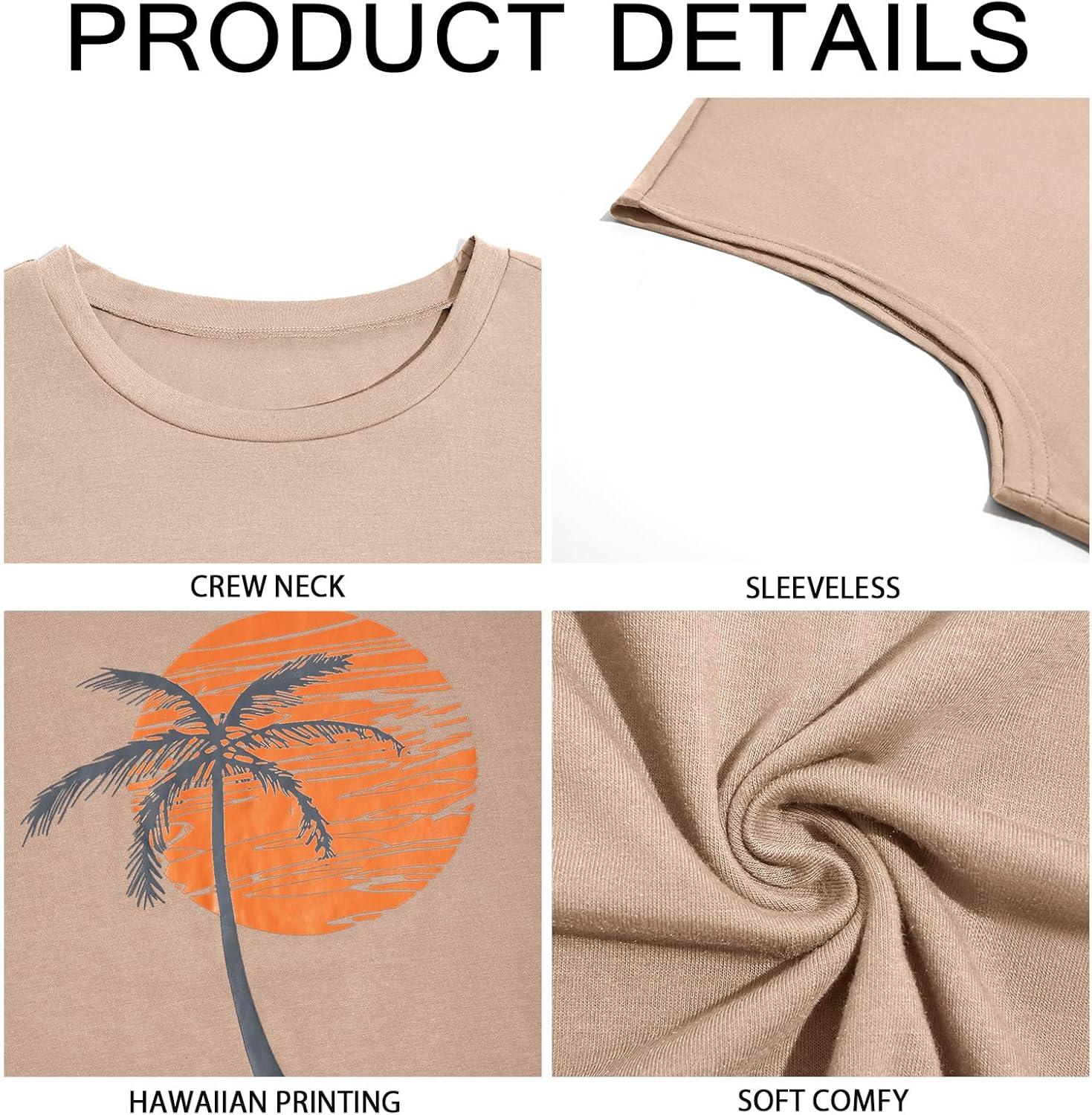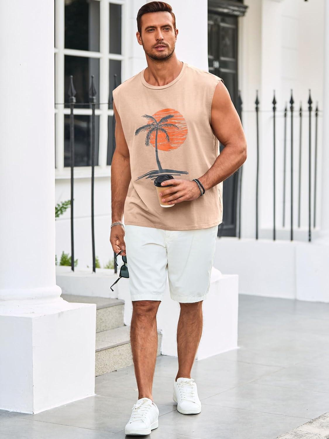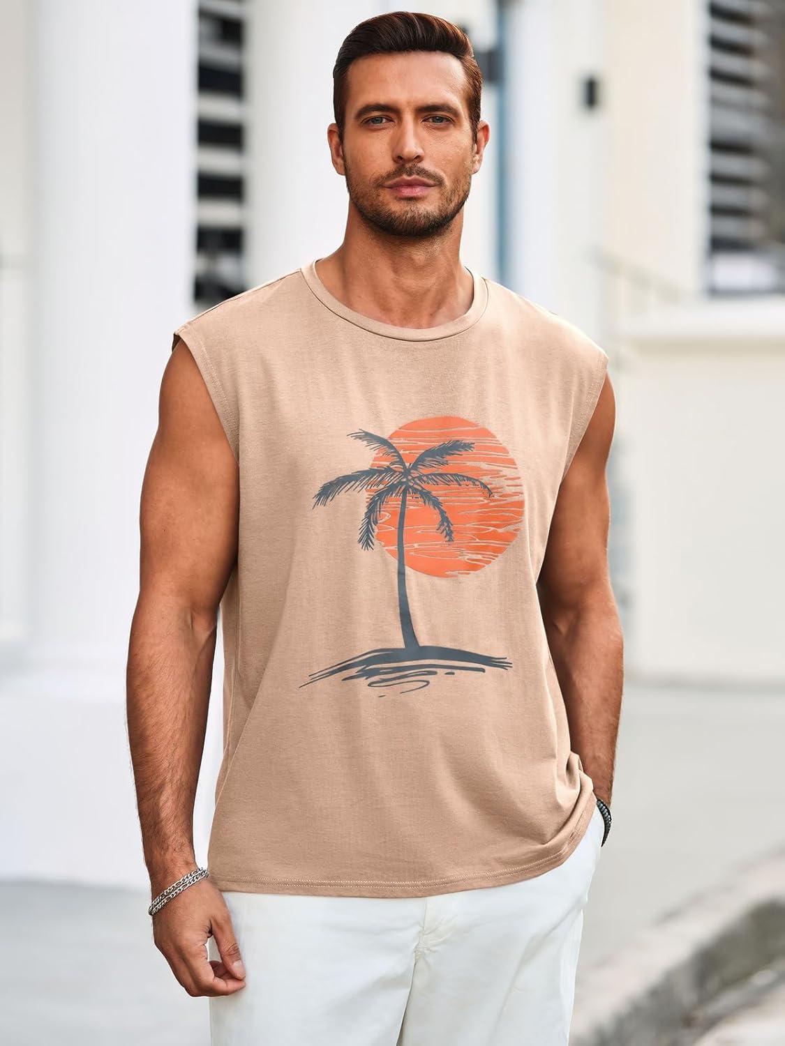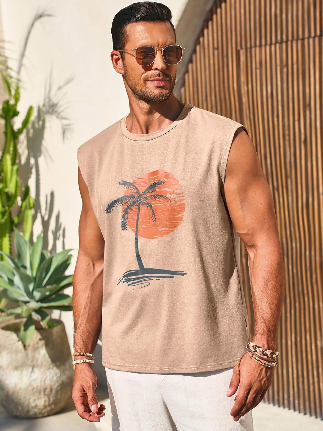 Runcati Mens Sleeveless Tank Tops Workout Gym Muscle Shirts Palm Tree Vintage Hawaiian Summer Beach T Shirts(Khaki)