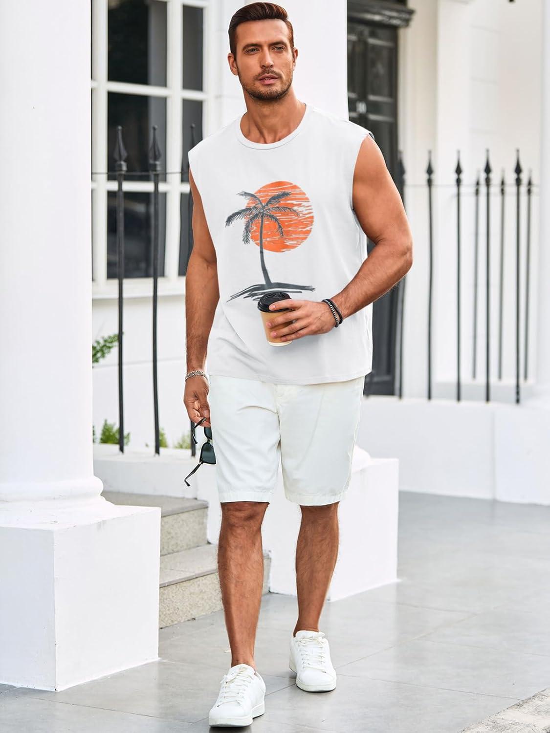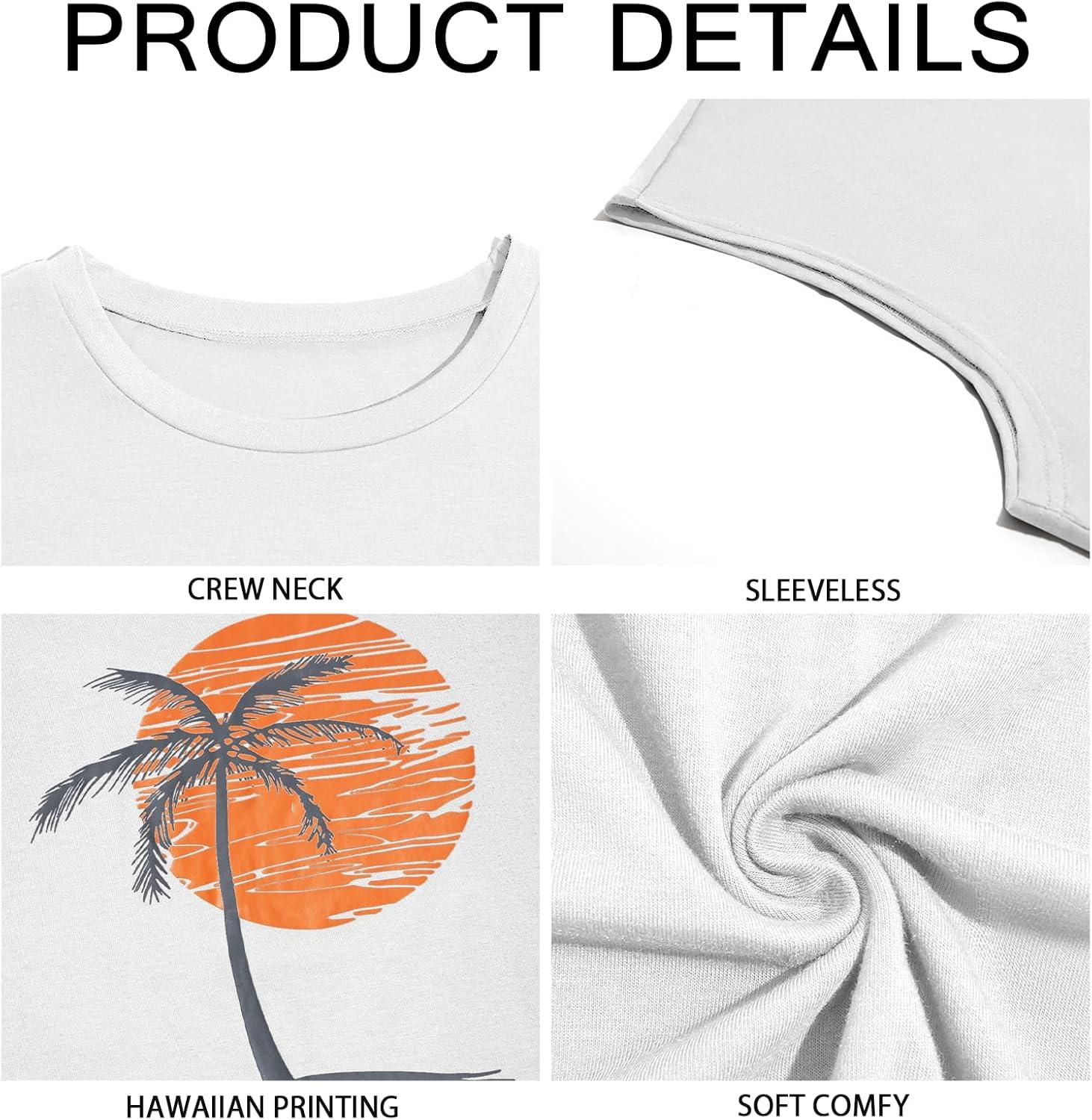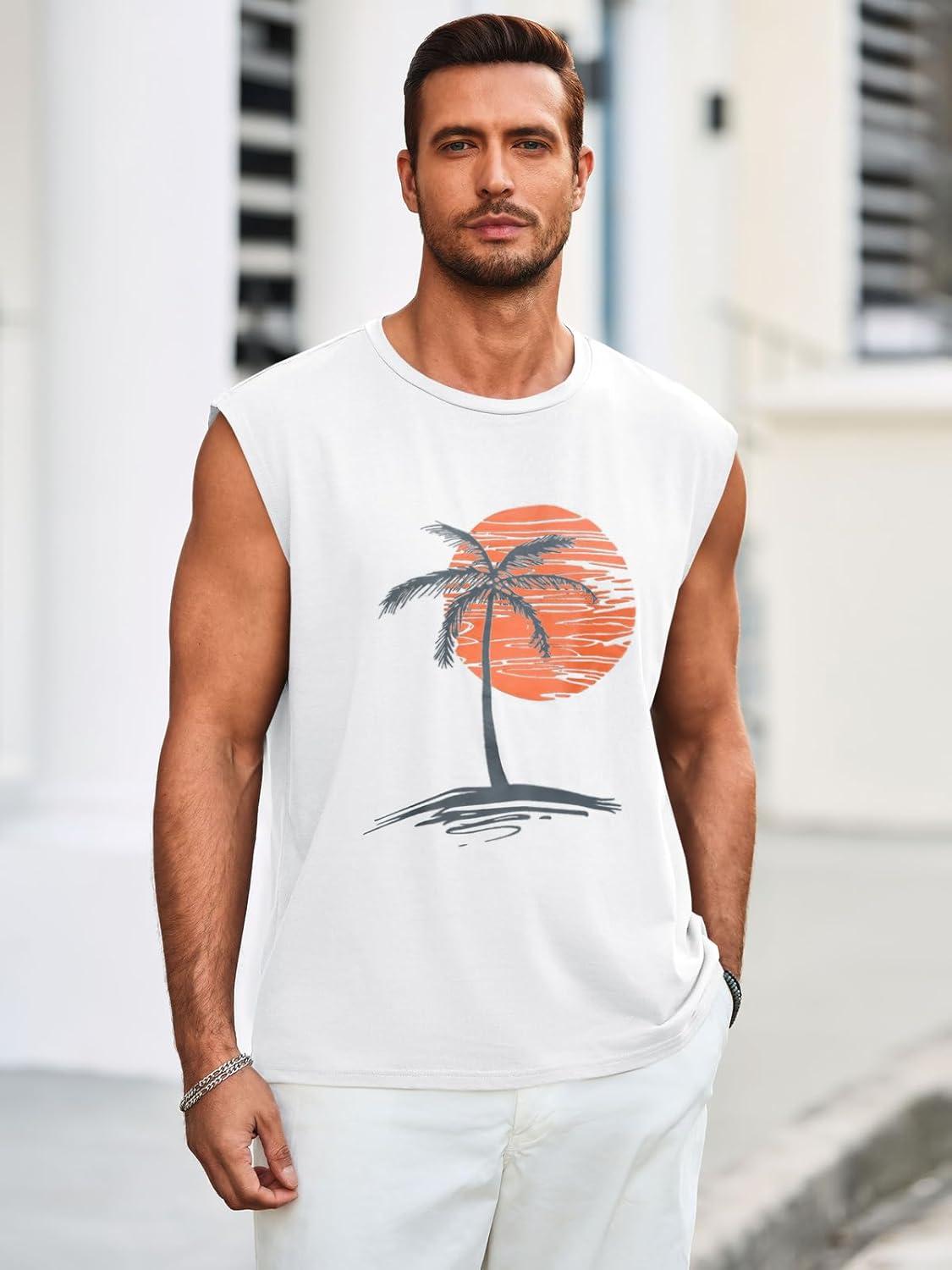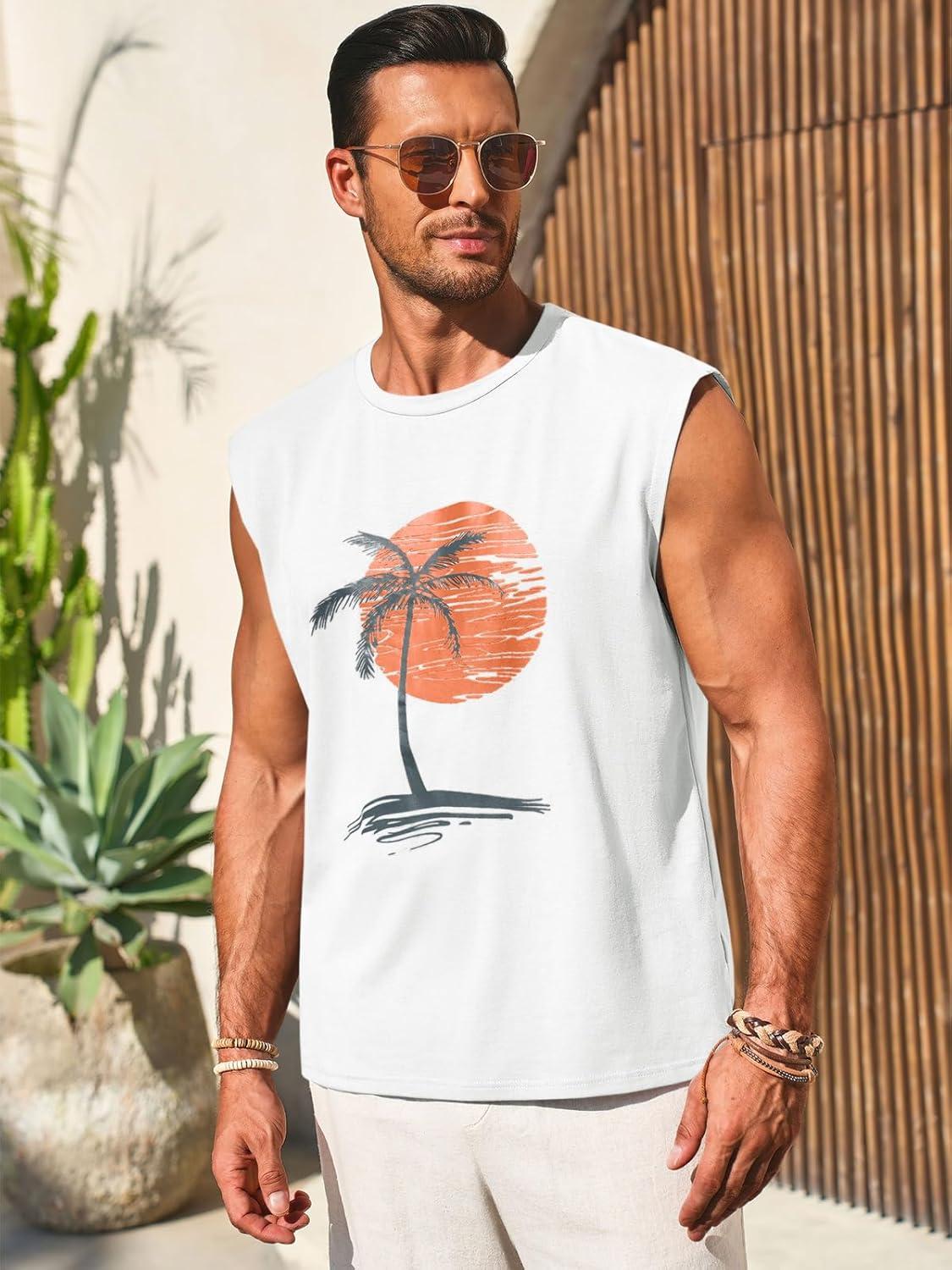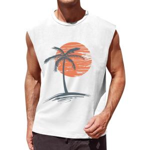 Runcati Mens Sleeveless Tank Tops Workout Gym Muscle Shirts Palm Tree Vintage Hawaiian Summer Beach T Shirts(White)