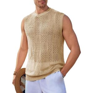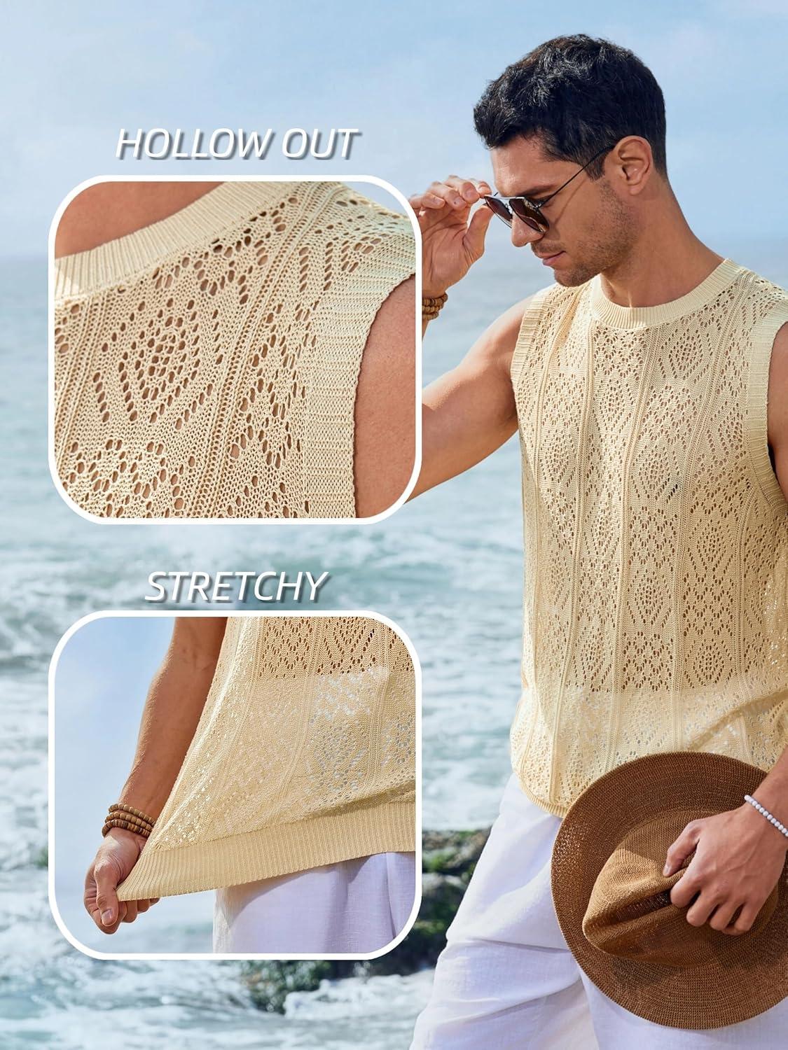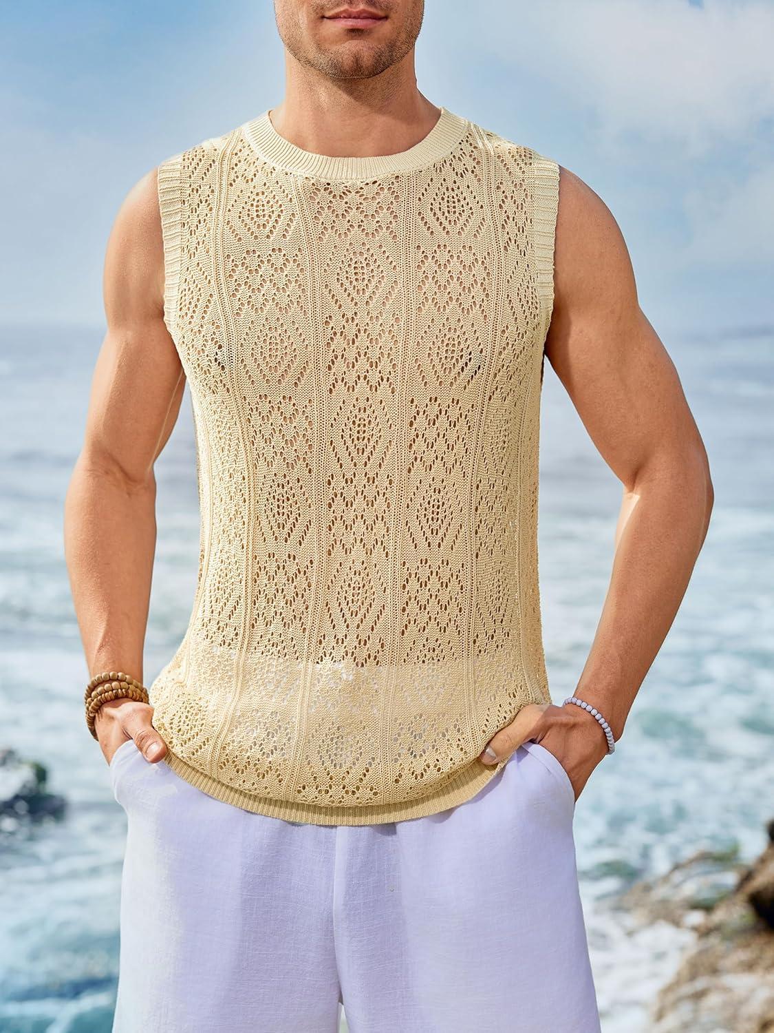 Runcati Mens Sleeveless Crewneck Tank Top Casual Mesh Hollow Out Cotton Knit Summer Beach T Shirt(Beige)