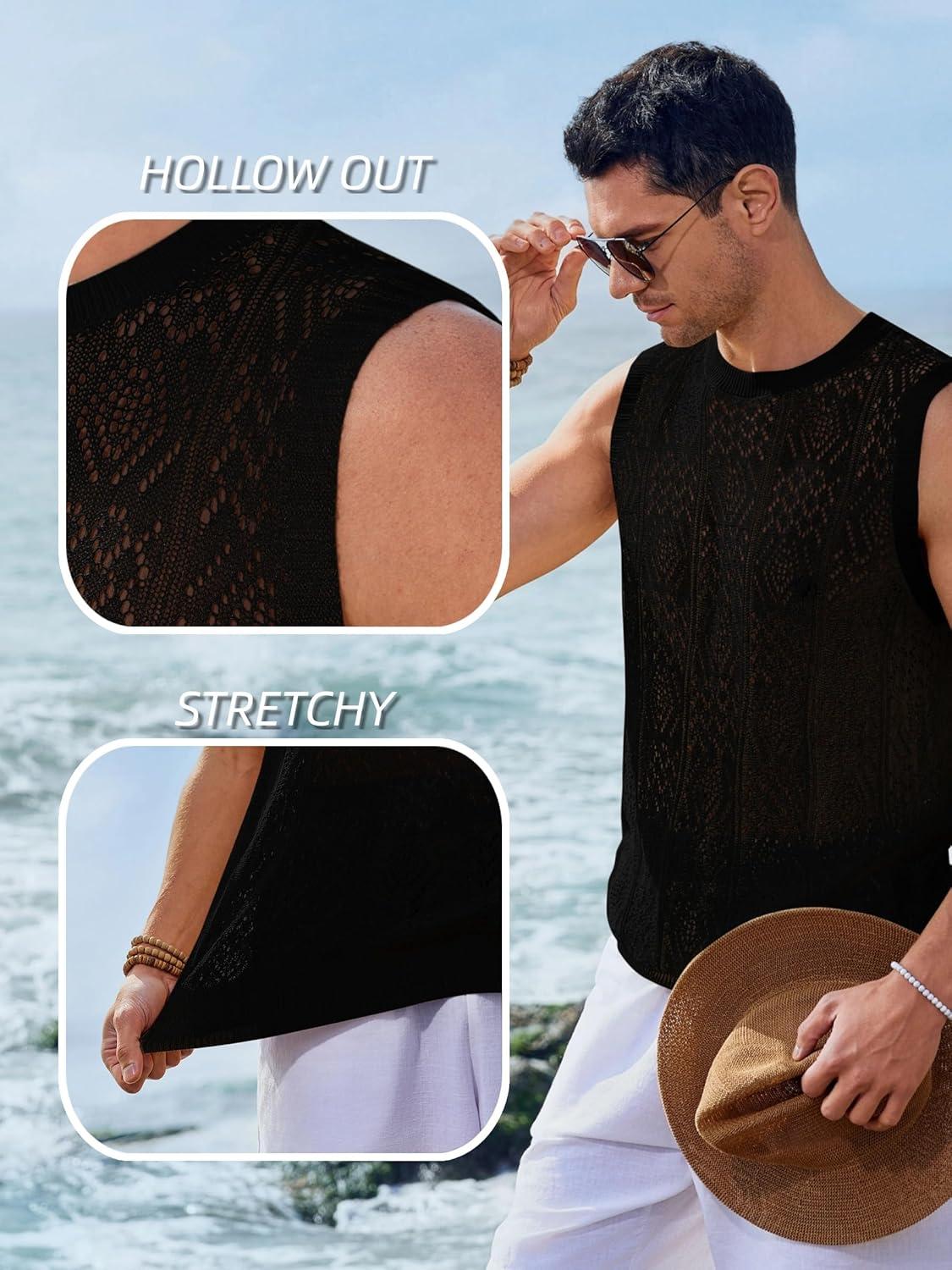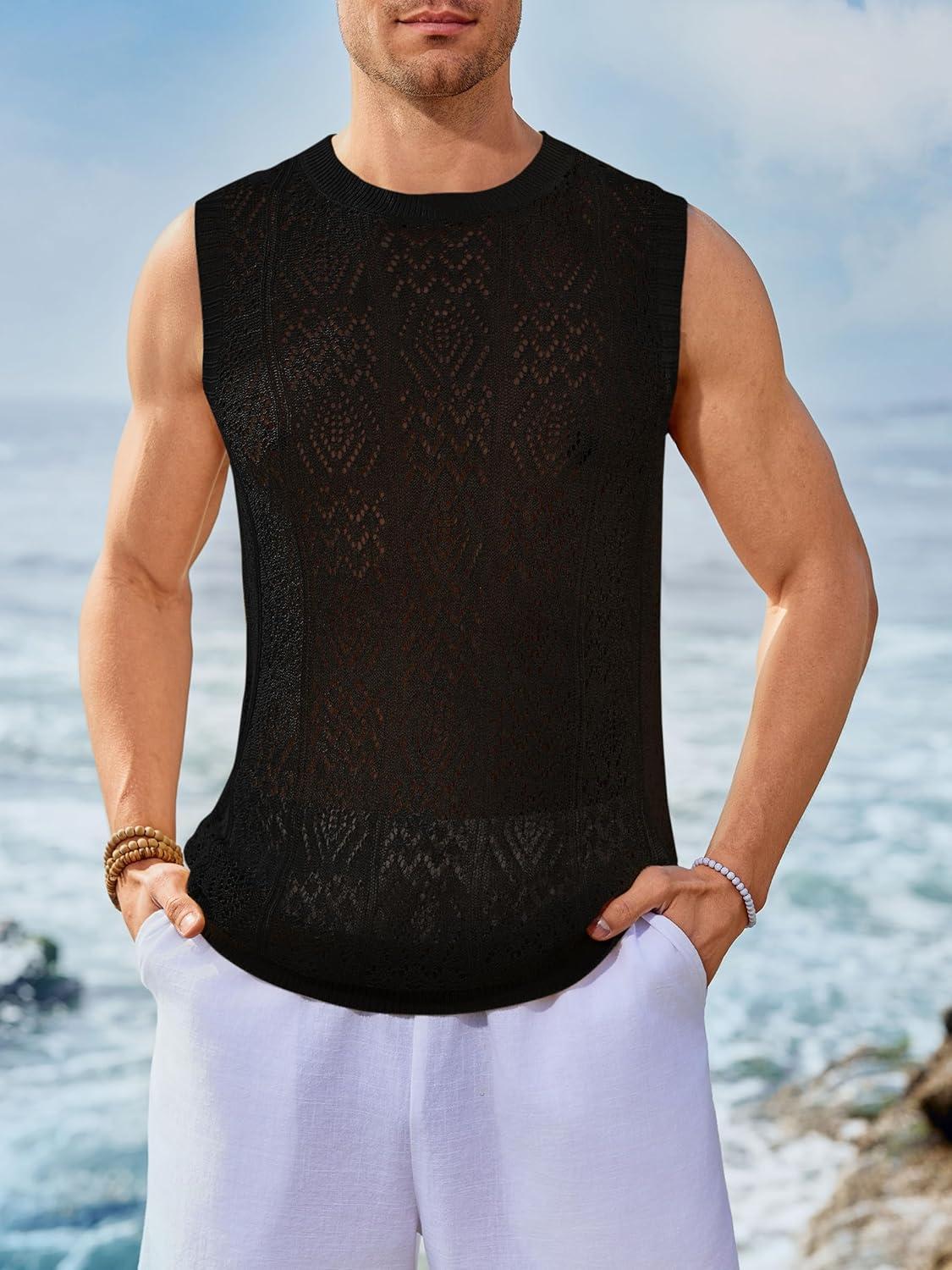 Runcati Mens Sleeveless Crewneck Tank Top Casual Mesh Hollow Out Cotton Knit Summer Beach T Shirt(Black)