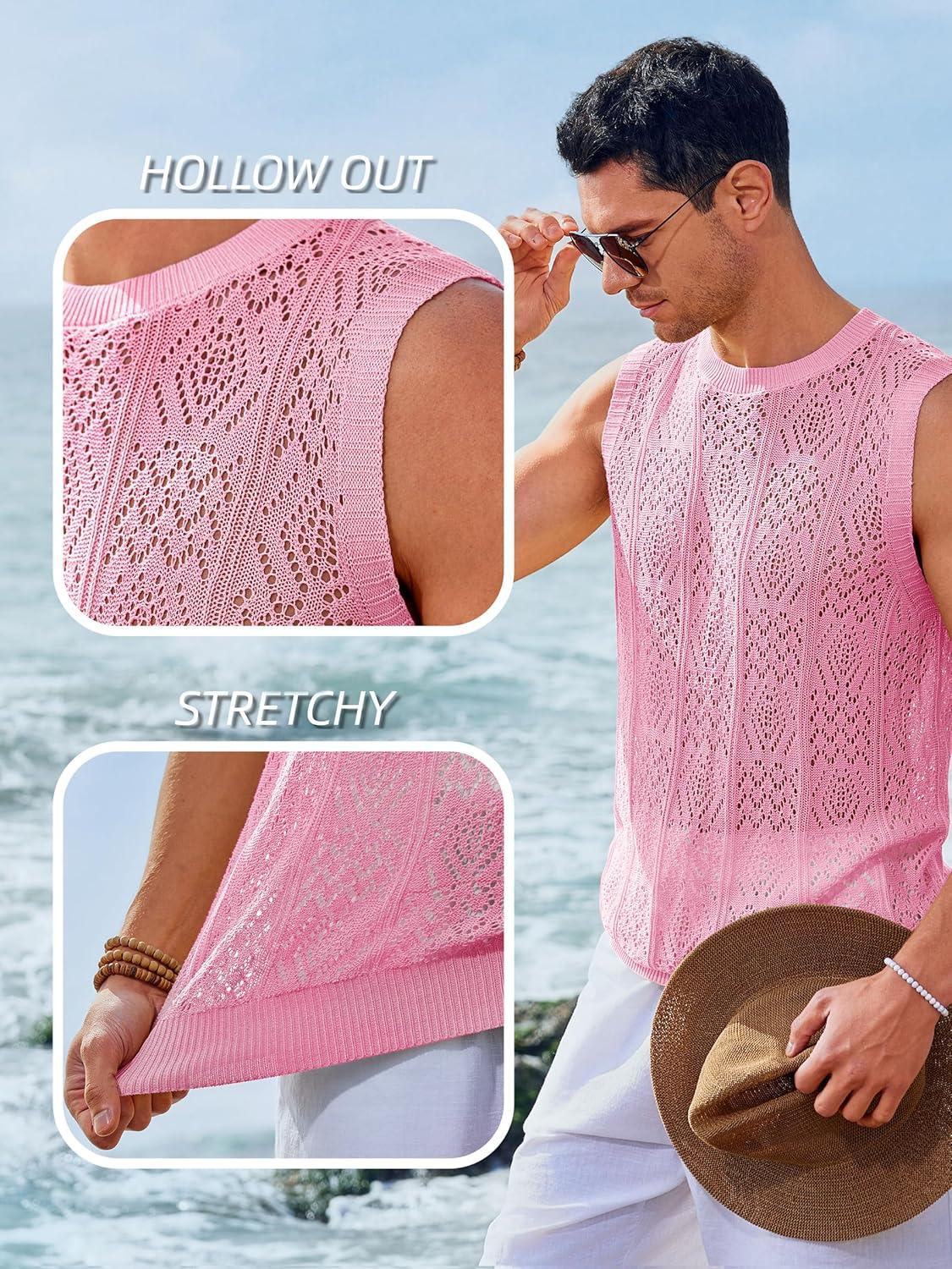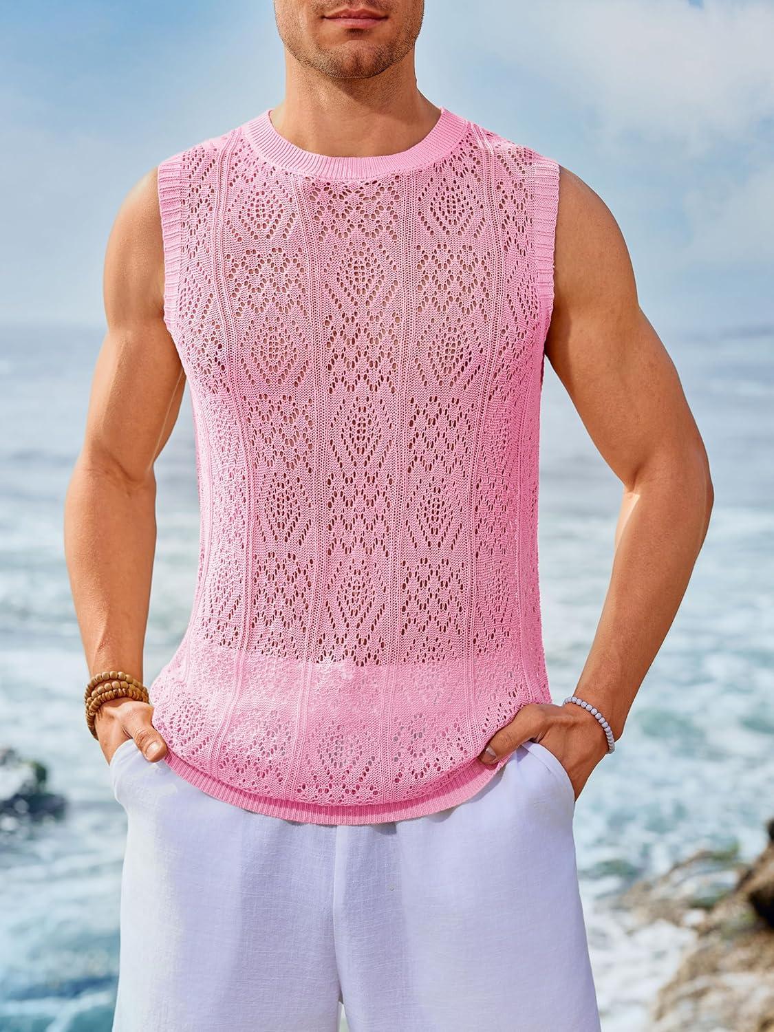 Runcati Mens Sleeveless Crewneck Tank Top Casual Mesh Hollow Out Cotton Knit Summer Beach T Shirt(Pink)