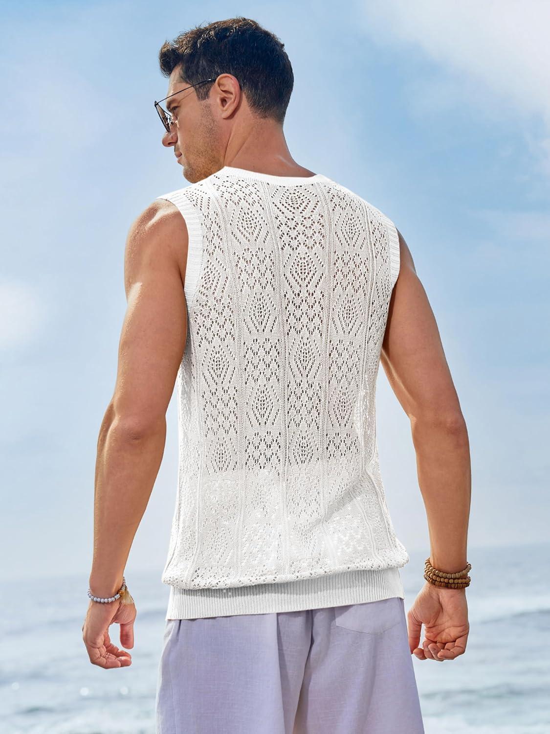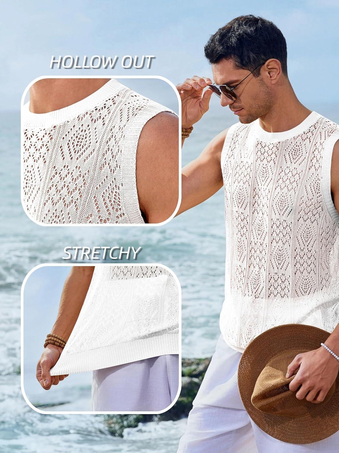 • Runcati Mens Sleeveless Crewneck Tank Top Casual Mesh Hollow Out Cotton Knit Summer Beach T Shirt(White)