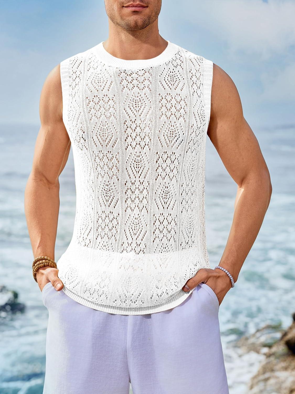 Runcati Mens Sleeveless Crewneck Tank Top Casual Mesh Hollow Out Cotton Knit Summer Beach T Shirt(White)