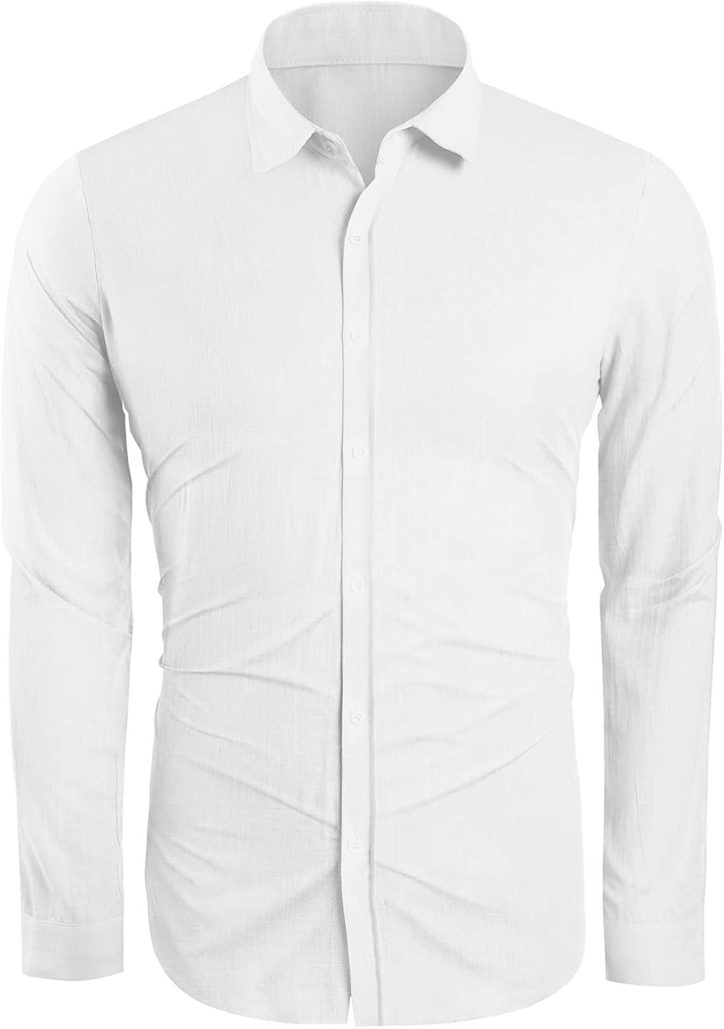 Mens Button Down Shirt Linen Cotton Shirts Casual Long Sleeve Spread Collar Lightweight Beach Plain Tops(01 White)