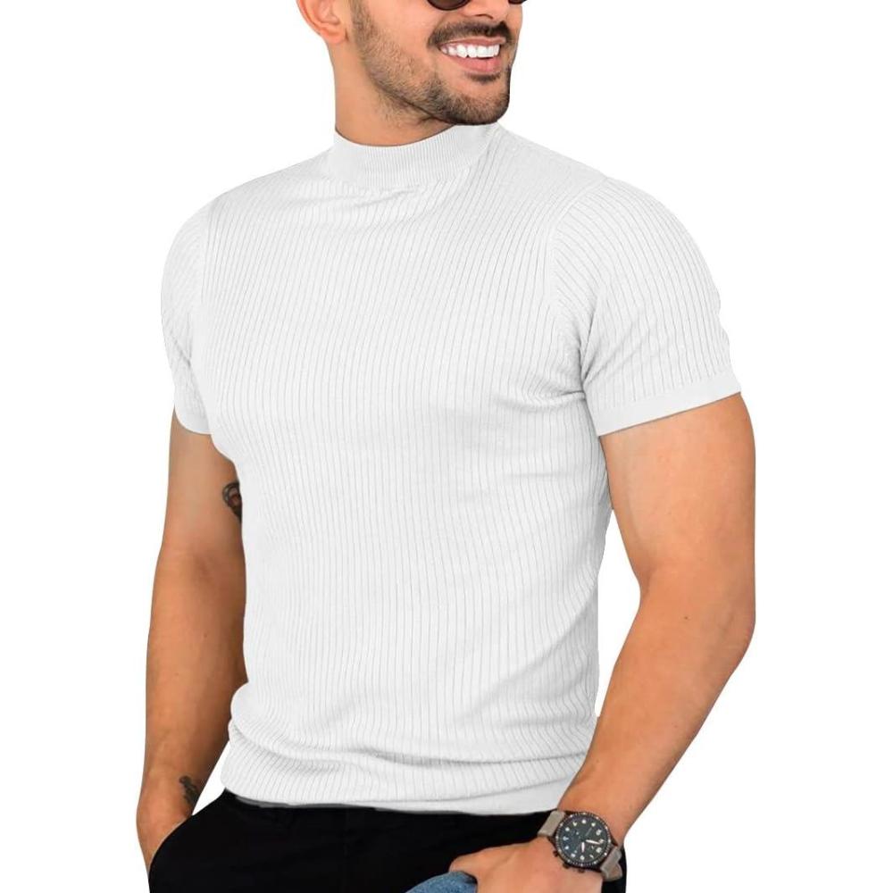 Mens Casual Slim Fit Basic Tops Short Sleeve Shirt Turtleneck T Shirts Rib Knitted Stretch Pullover Sweater(01 White)