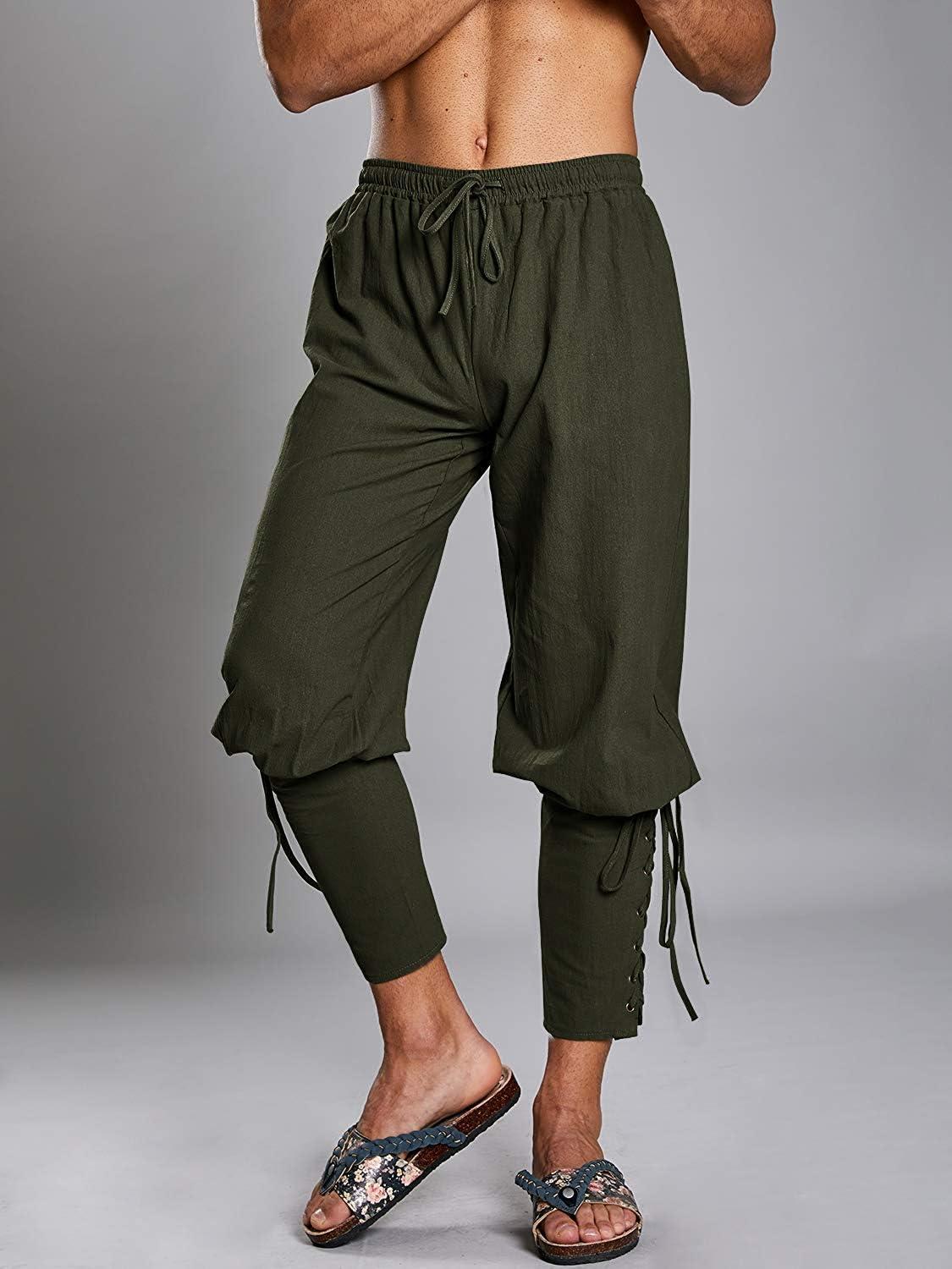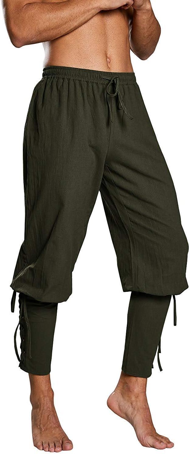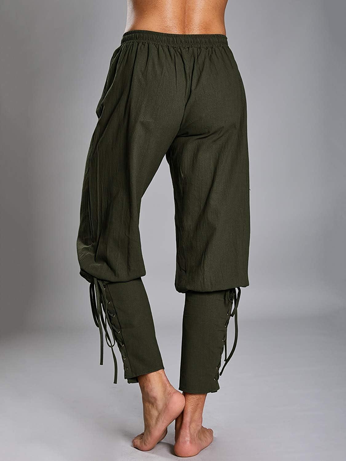 Mens Medieval Ankle Pants Viking Pirate Renaissance Costume Lace Up Tapered Banded Navigator Casual Trousers(01 Army Green)