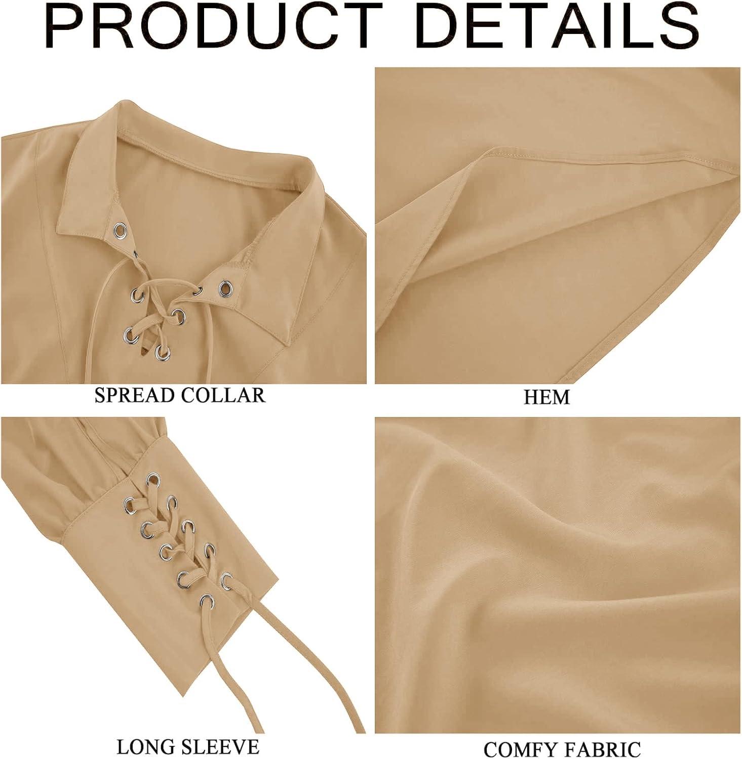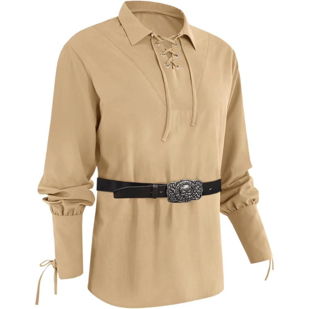 Mens Medieval Lace Up Pirate Mercenary Scottish Wide Cuff Shirt Costume Renaissance Viking Top(Khaki)