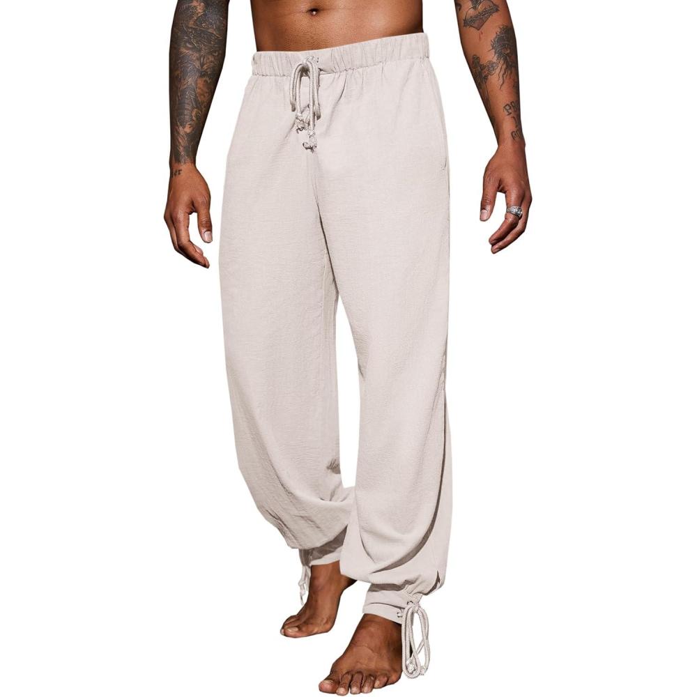 Runcati Mens Banded Ankle Pants Medieval Renaissance Viking Pirate Lace Up Halloween Cotton Gothic Costume Trousers(Beige)
