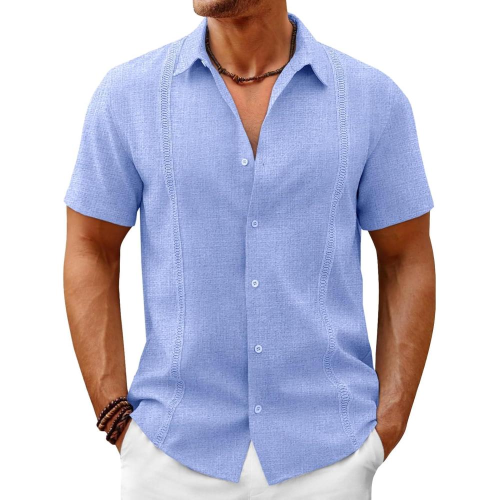 Runcati Mens Button Down Guayabera Shirts Short Sleeve Cuban Casual Summer Linen Shirt Beach Mexican Hippie Wedding Tops(Baby Blue)