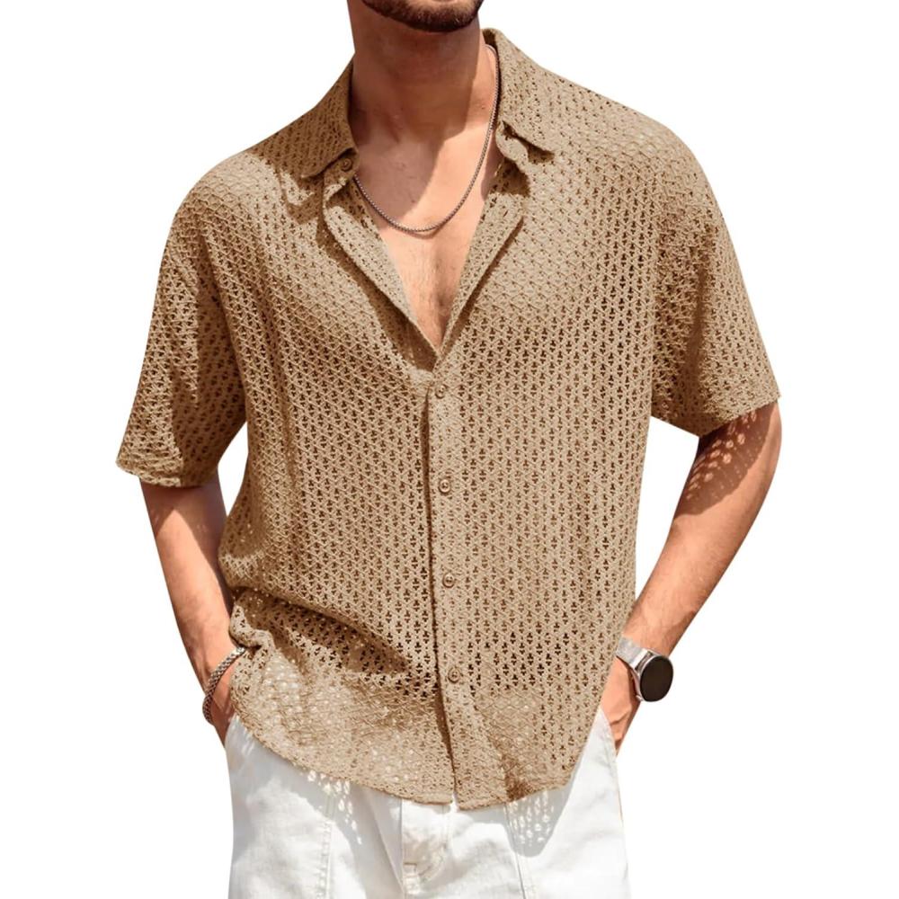 Runcati Mens Button Down Shirt Knit Crochet Hollow Out Short Sleeve Sweater Casual Summer Tops(Khaki)